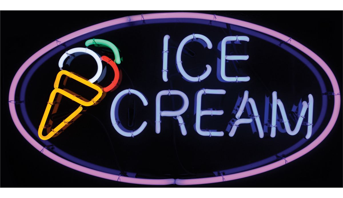 Soda fountain "Ice Cream" 6-color neon sign, NOS in Exc cond, backed w/Lucite, 20"H x 37"W.