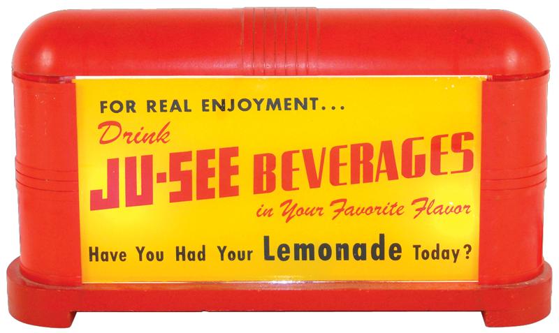 Soda fountain Ju-See Beverages light-up counter sign, hard plastic & wood case w/reverse glass adv p