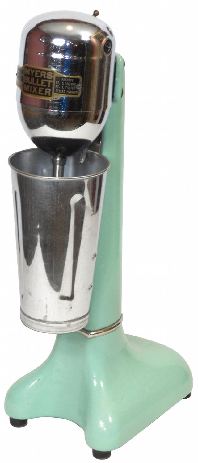 Soda fountain Myers Bullet Mixer, mint green porcelain, Exc working cond, 18.5"H.