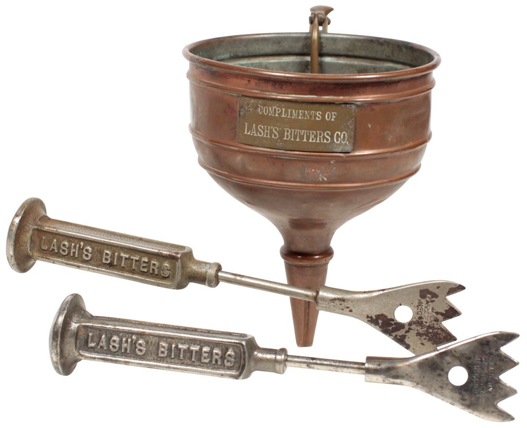 Soda fountain funnel & box openers (3), all w/adv for Lash's Bitters, copper funnel w/stopper & cast iron openers, all Exc cond, up to 10"L.