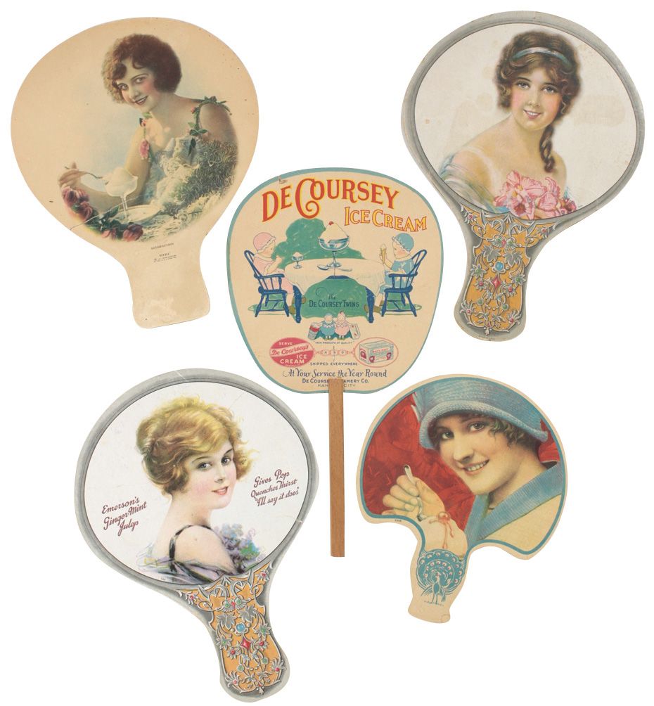 Soda fountain ice cream signs & fans (8), includes (3) Imperial Ice Cream framed cdbd signs, VG cond, 16"H x 12"W & De Coursey Ice Cream, Emerson's Ginger-Mint Julep, "Satisfaction", dated 1921 (tear), pretty girl w/adv on back from Salisbury's-Bushnell's Popular Meeting Place" & another w/pretty girl eating ice cream, all in Good to VG cond, 3 w/some bend, 8.5"H to 13"H.