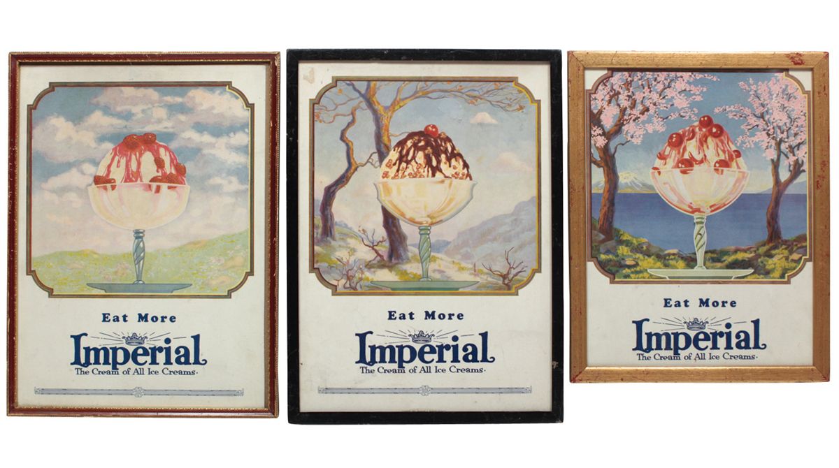 Soda fountain ice cream signs & fans (8), includes (3) Imperial Ice Cream framed cdbd signs, VG cond