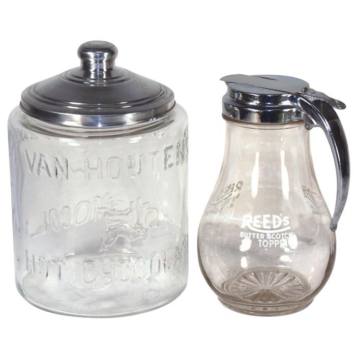 Soda fountain items (2), Reed's Butter Scotch Topping pitcher & embossed Van Houten's Hot Chocolate powder jar w/lid, both in VG to Exc cond, 8.75"-10"H.