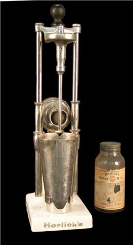 Soda fountain milk shake machine; Horlicks Orig. Malted Milk Shake - logo on porcelain base By Dumore SN8192 With can and Horlicks malt jar.