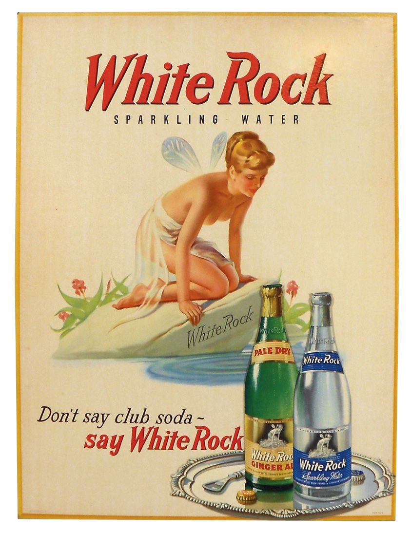 Soda fountain sign, White Rock Sparkling Water, diecut cdbd w/great graphics, Exc NOS cond, 30"H x 22.5"W.