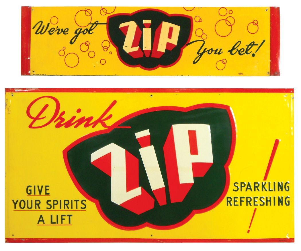 Soda fountain signs (2), "Drink Zip" & "We've got Zip you bet!", both litho on embossed metal, both