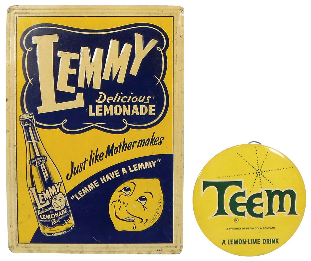 Soda fountain signs (2), Lemmy, embossed litho on metal & Teem celluloid button, VG cond, Lemmy 19.75"H x 13.75"W.
