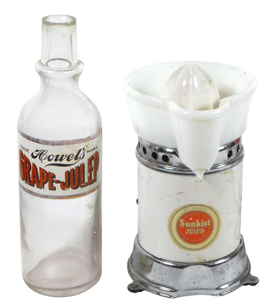 Soda fountain syrup bottle, Howel's Grape Julep, applied label, no lid, o/wise Good/VG cond, 11.5"H & Sunkist Juicit, large chip on milk glass spout, o/wise Good working cond, 9"H.