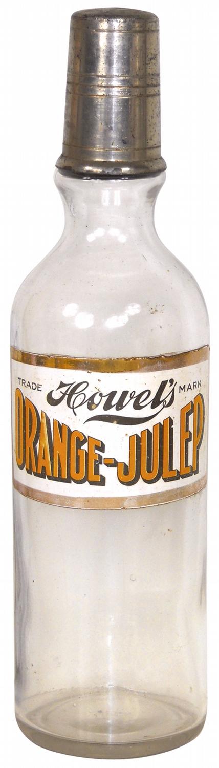 Soda fountain syrup bottle, Howel's Orange-Julep, metallic gold paper label & metal pour cap, c.1920, Exc cond, 12.5"H.