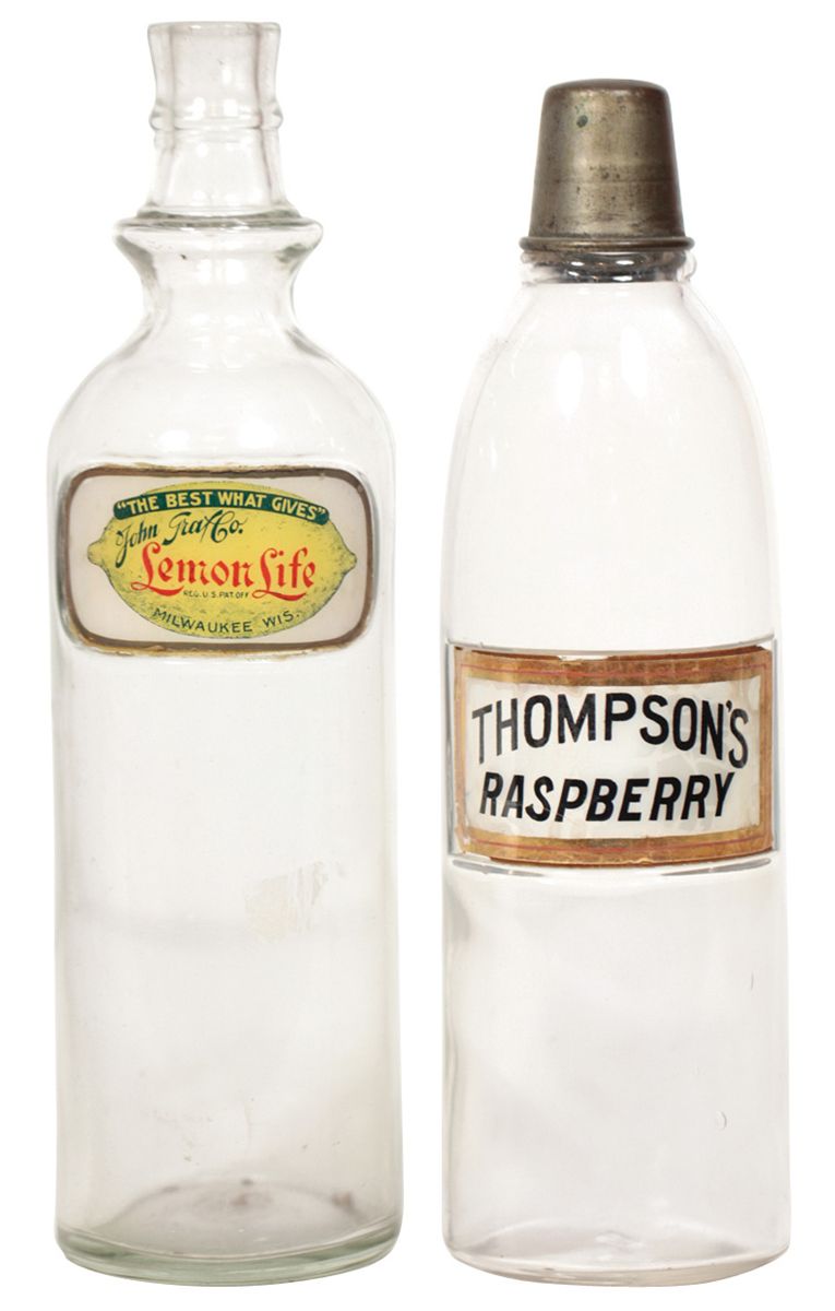Soda fountain syrup bottles (2), John Graf Co. Lemon Life (no lid) & Thompson's Raspberry, both label under glass, Exc cond, 11.75"H.