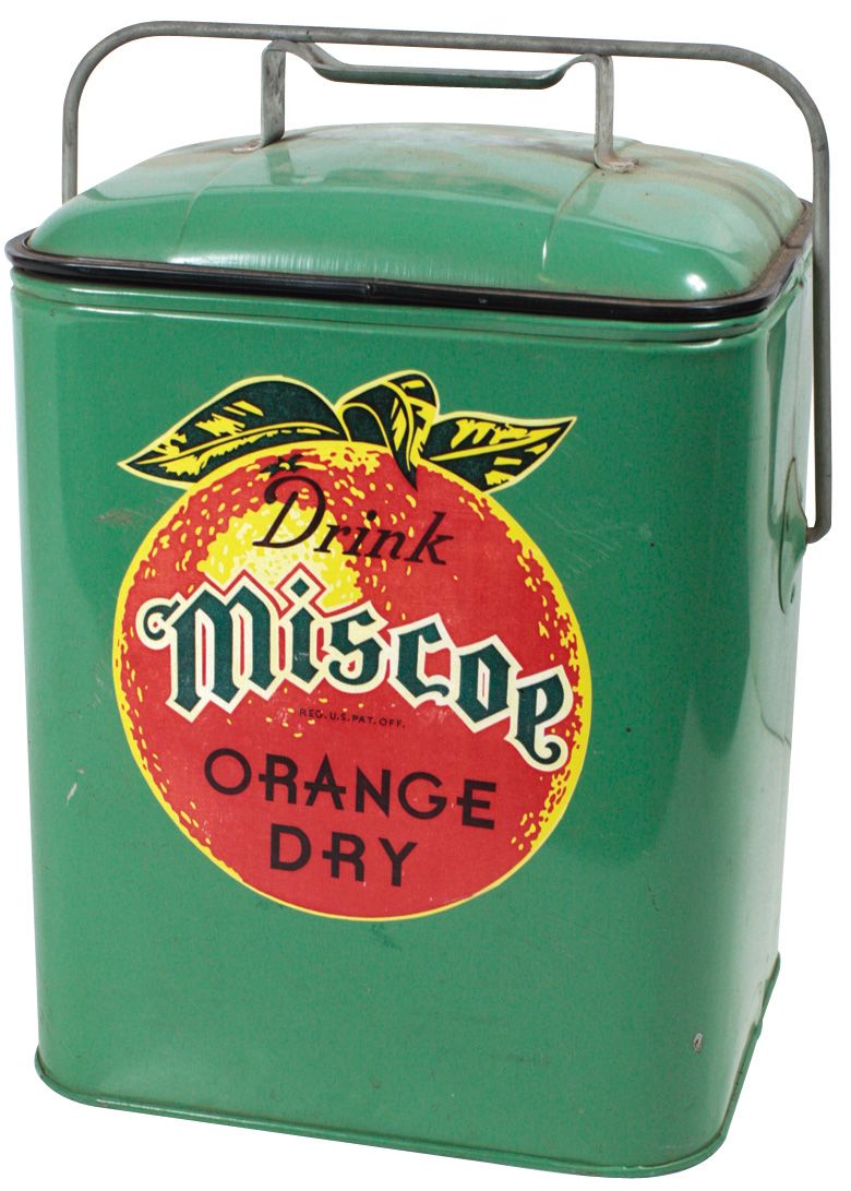 Soda pop cooler w/adv decal for Miscoe Orange Dry, cooler in Exc cond w/orig paint, cute small size,