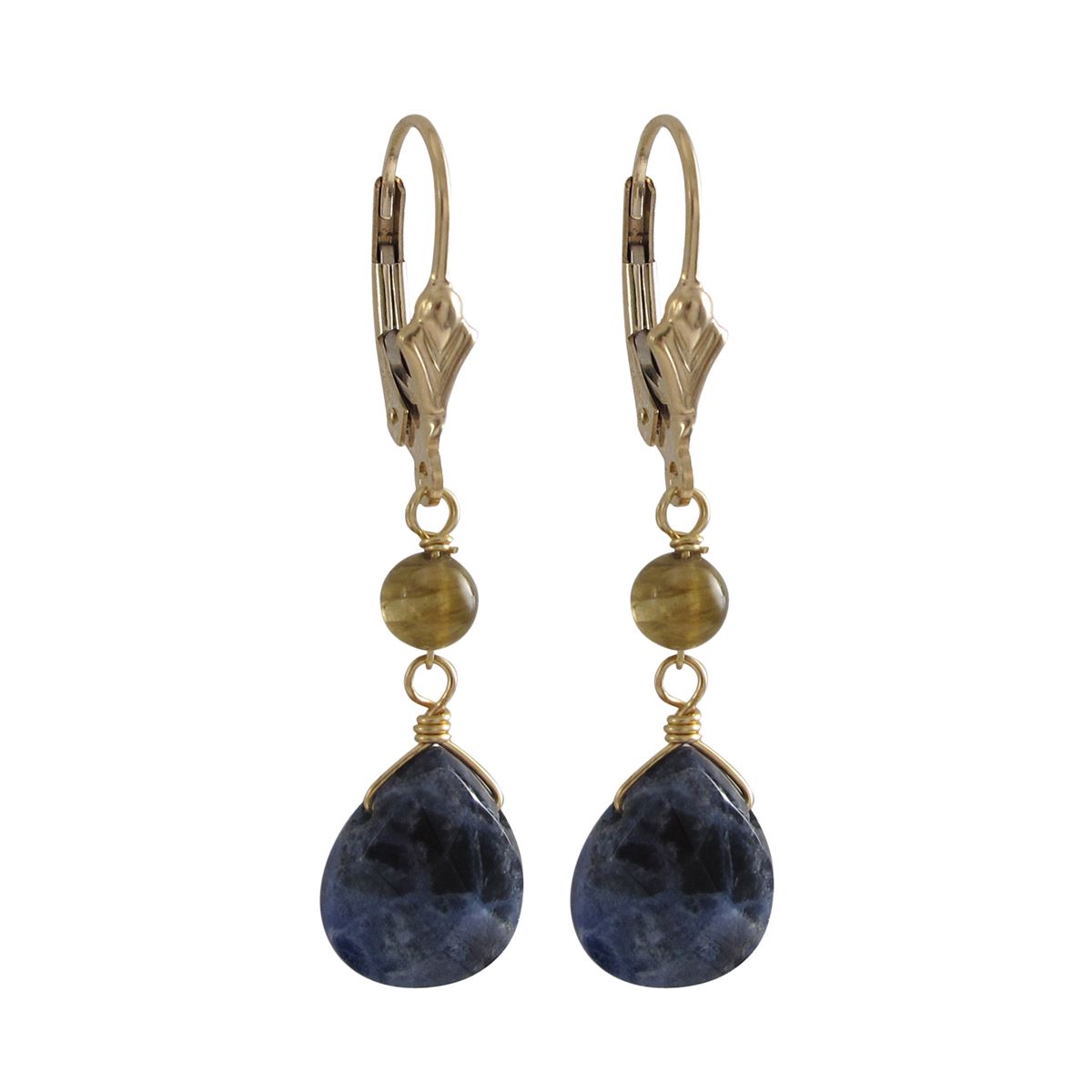 Sodalite(Blue) 9.5X11mm Teardrop And Labradorite(Grey) 4Mm Ball Semi Precious Stones On Gold Filled Lever Back Earrings, 1.54"
