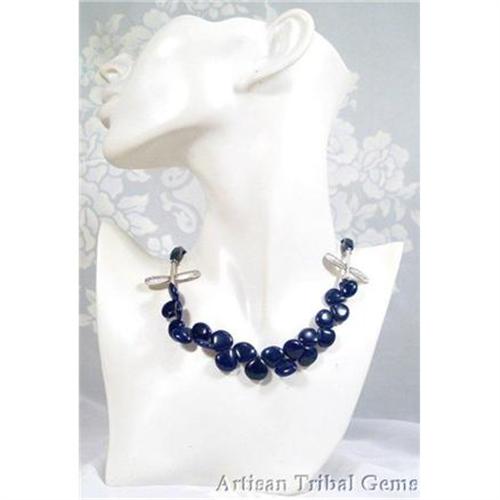 Sodalite Gemstone Silver Choker... The most delicate presentation of rich deep color of sodalite accented with contrasting shapes complimented with Karen tribal silver. A real winner and you will not see your neighbor sporting the same necklace! A gram weight of 54 with an overall length of 17" our gemstone necklace is the perfect accessory for any occassion. The center sodalite briolettes average 14mm for perspective to size. For those not familiar with metric 25mm=1". (d535)
