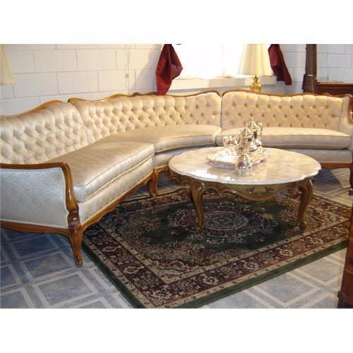 This is a custom design sofa done by Soref?s Period Furniture Co. in Chicago. Maple wood and light cream upholstery. Has a stain under one cusion, needs to be washed otherwise in great shape, no damages. 3 sections that you can seperate.