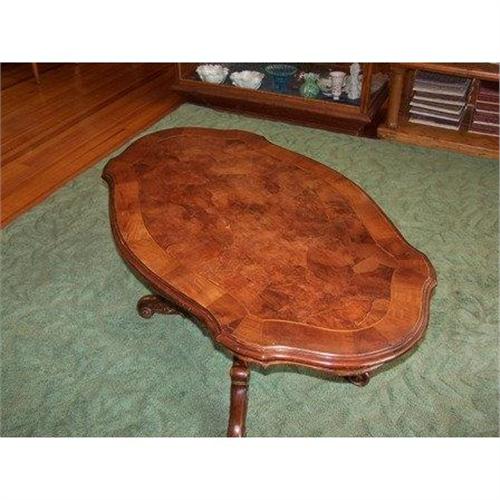 French Walnut and Walnut Burl Rococo Style Sofa Table. Oval shaped "Turletop shaped" veneer top. Center section of top inlayed with walnut burl "freeform" sections and a 2.5" wide band of walnut thick veneer. Hand Carved maple legs at base compliments the curved apron and oval top. Circa 1920-1940.