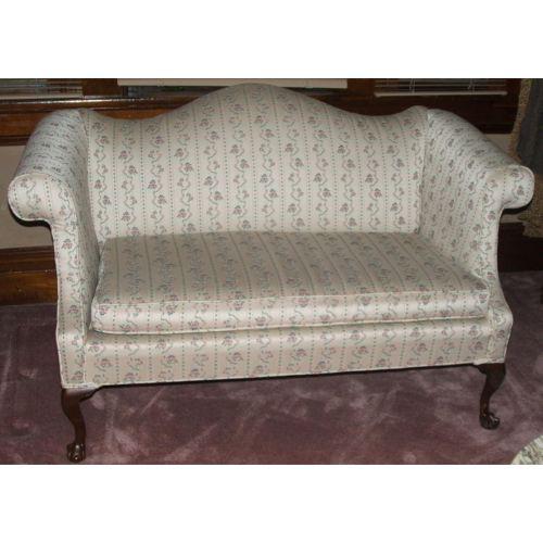 Small sofa upholstered with floral design on a white background, cabriole legs and ball and claw feet. 34" high
