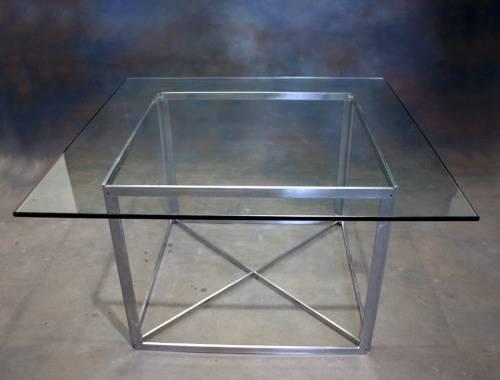 Soffbord glasskiva på mattförkromad benställning "PK 40" Poul Kjaerholm för Fritz Hansen 1985 H 63 skiva 115x115