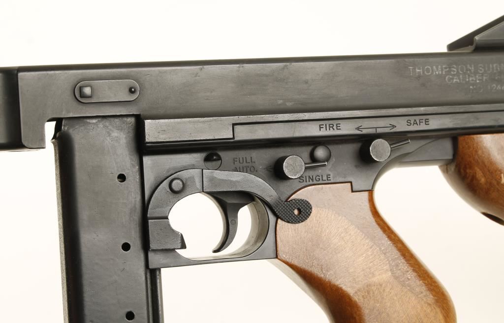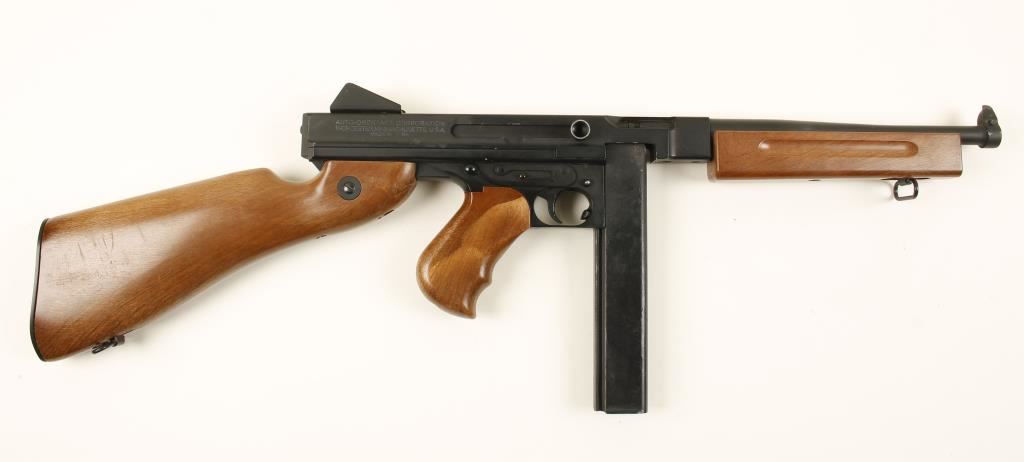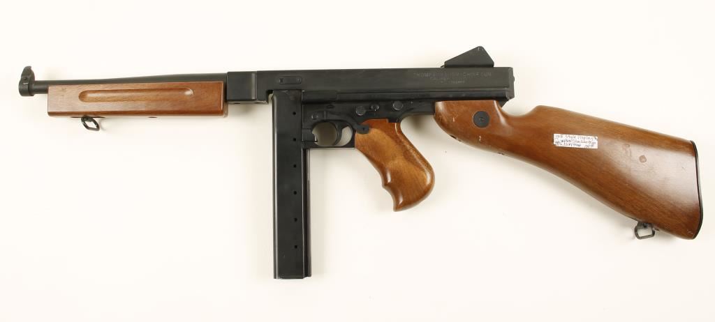 Auto Ordnance licensed copy of the M1A1 Thompson sub-machine gun of WWII fame. Meant to fire 6mm plastic BBs but we don't have the battery charger or instruction manual on how it works. Metal receiver and barrel with wood-grain plastic furniture.
