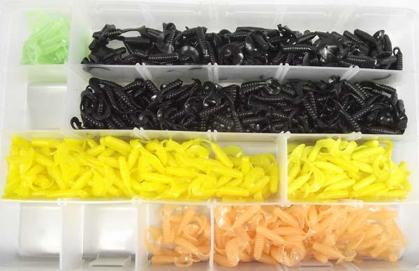 Collection of Soft Plastic Fishing Lure Worms. Largest measures approx. 2 1/4'' long. Black, yellow, green, peach. All in plastic container. Buyers Pay Actual Shipping and Handling Charges(see terms and conditions for more information).