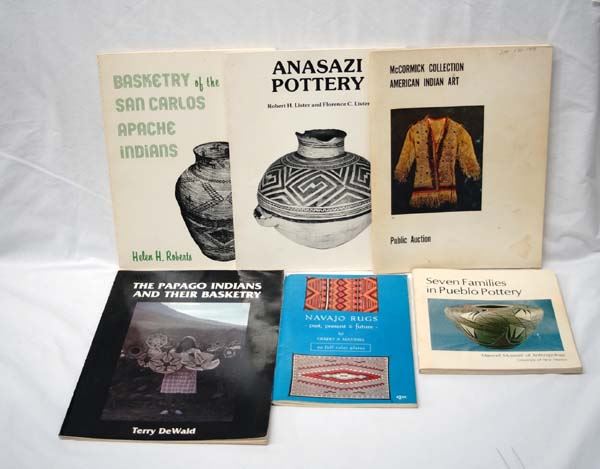 Softback Reference Books, Native American Interest, largest measures 8.5'' x 11'', 1. Seven Families in Pueblo Pottery Maxwell Museum of Anthropology Unitersity of New Mexico Press, c. 1974, 112pgs. 2. Navajo Rugs-Past, Present, & Future by Gilbert S. Maxwell, 1971 Best-West Publications, 72pgs. 3. McCormick Collection American Indian Art Public Auction Catalog 1974 4. Basketry of the San Carlos Apache Indians by Helen H. Roberts, c. 1972 Rio Grande Press, 218pgs. 5. The Papago Indians and Their Baskets by Terry DeWald, c. 1979 Terry DeWald Publications, 48pgs. 6. Anasazi Pottery by Robert H. Lister and Florence C. Lister, c. 1978 Maxwell Museum of Anthropology and the University of New Mexico Press, 94pgs.