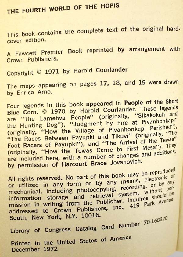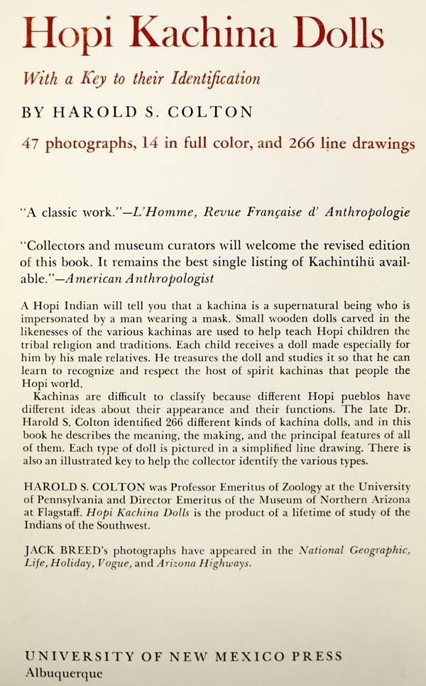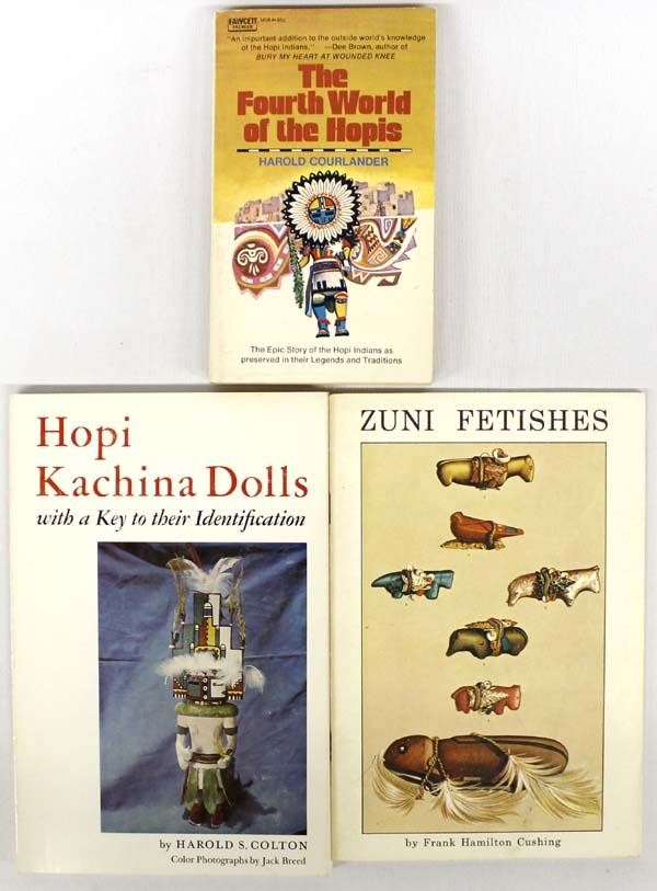 3 Softback Reference Books, Native American Interest, includes: 1. The Fourth World of the Hopis by Harold Courlander, softback book c. 1971 Fawcett Premier Book, Fawcett Publications, Inc., Greenwich, Conn. 2. Hopi Kachina Dolls: with a Key to their Identification by Harold S. Colton, c. 1977 University of New Mexico Press, Albuquerque 3. Zuni Fetishes by Frank Hamilton Cushing, c. 1974 Fifth Printing, Facsimile Edition by KC Publications, Las Vegas NV