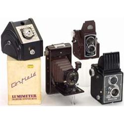 € 95,- 1) "Soho Cadet", 1930, dunkelbraune Bakelitkamera, 6 x 9 cm. - Brown bakelite camera. (3/3-) - 2) "Ross Ensign Ful-Vue Super", 1950, 6 x 6 cm, auberginenfarbener Strukturlack, (2/2). - Und: 3) "Ilford Craftsman", Bakelit, Reflex-Box, (3/2). - Sowie: 4) "Corfield Lumimeter", Labormeßgerät. - Enlarging exposure meter. (2/2) - € 150/200 - (62/161)