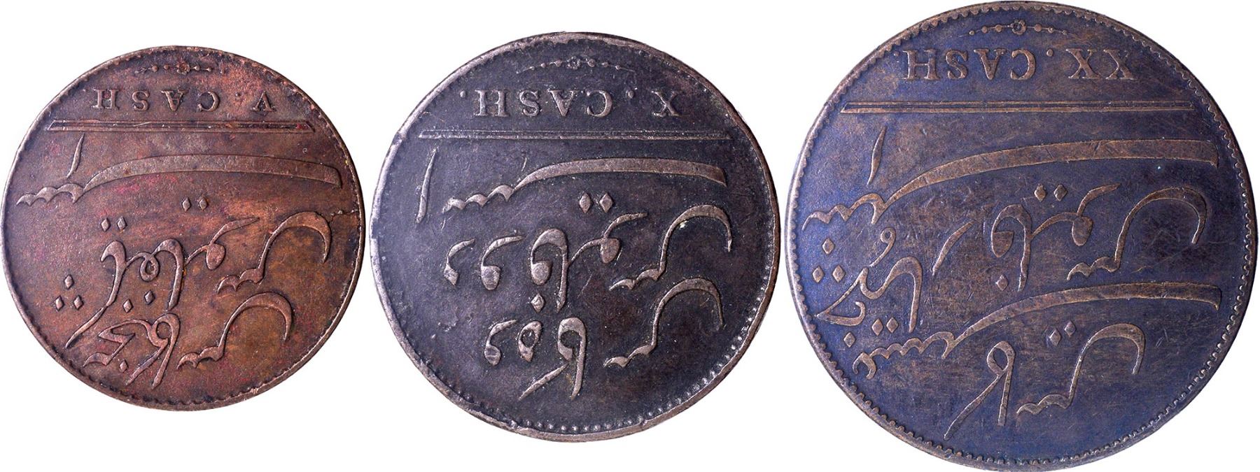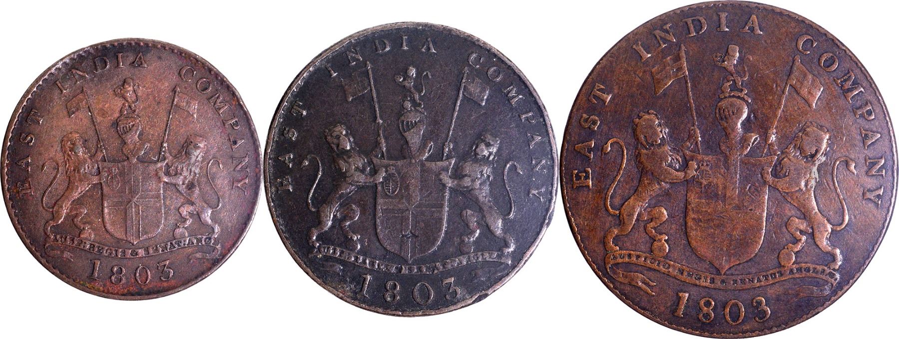 Madras Presidency, SohoMint, Set of 3 Copper Coins,5, 10 20 Cash,1803 AD, Inverted Die Axis,Obv:coat-of-arms of the EIC with supporters, date below, Roman legend EAST INDIA COMPANY,Rev:value in Persianand English,3.05g,20.85mm, 6.15g, 25.30mm, 12.80g, 30.41mm,(KM # 316, 319, 321/Prid # 208, 199, 190/Stevens # 5.139, 5.126,5.110),VF-XF.