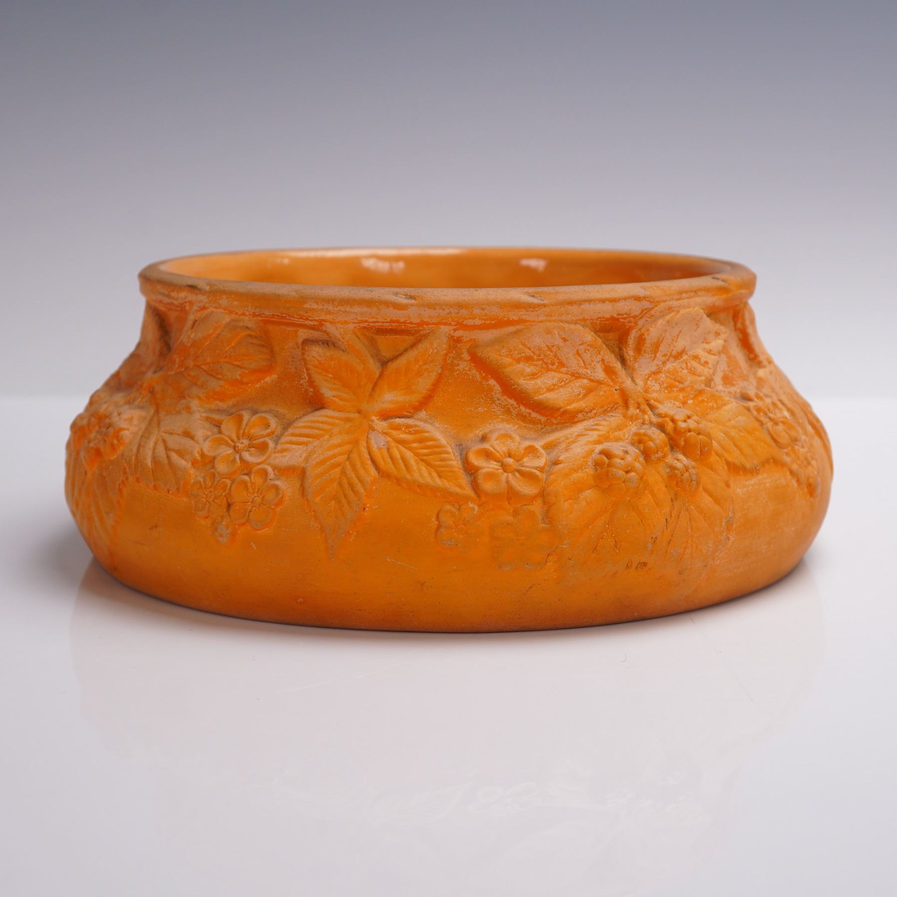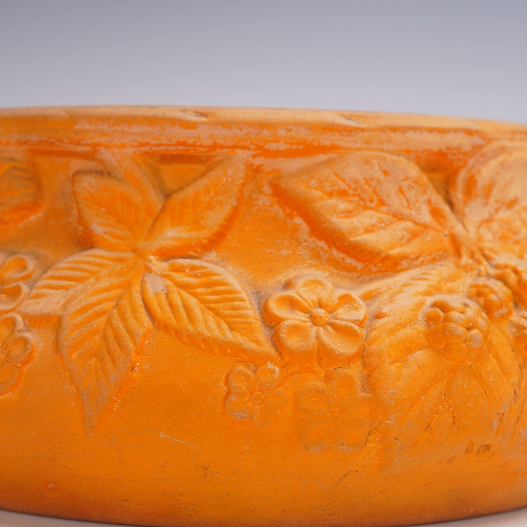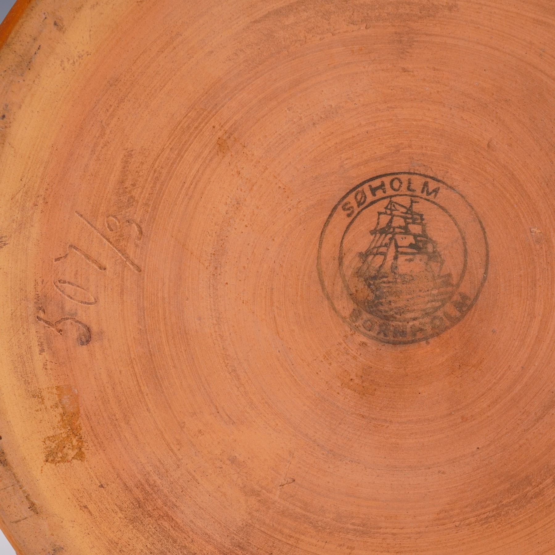 A richly textured terracotta-hued ceramic bowl by Soholm, a historic Danish pottery based on the island of Bornholm and active from 1835 to 1996. This piece features a detailed raised floral and berry motif around the exterior and a matte surface that highlights the sculptural relief. The base bears the classic Soholm sailing ship mark and incised form number 507/3. A fine example of Danish stoneware blending decorative craftsmanship with naturalistic form.