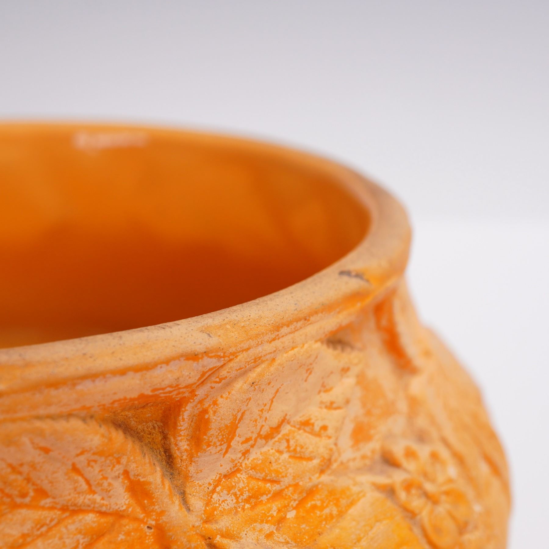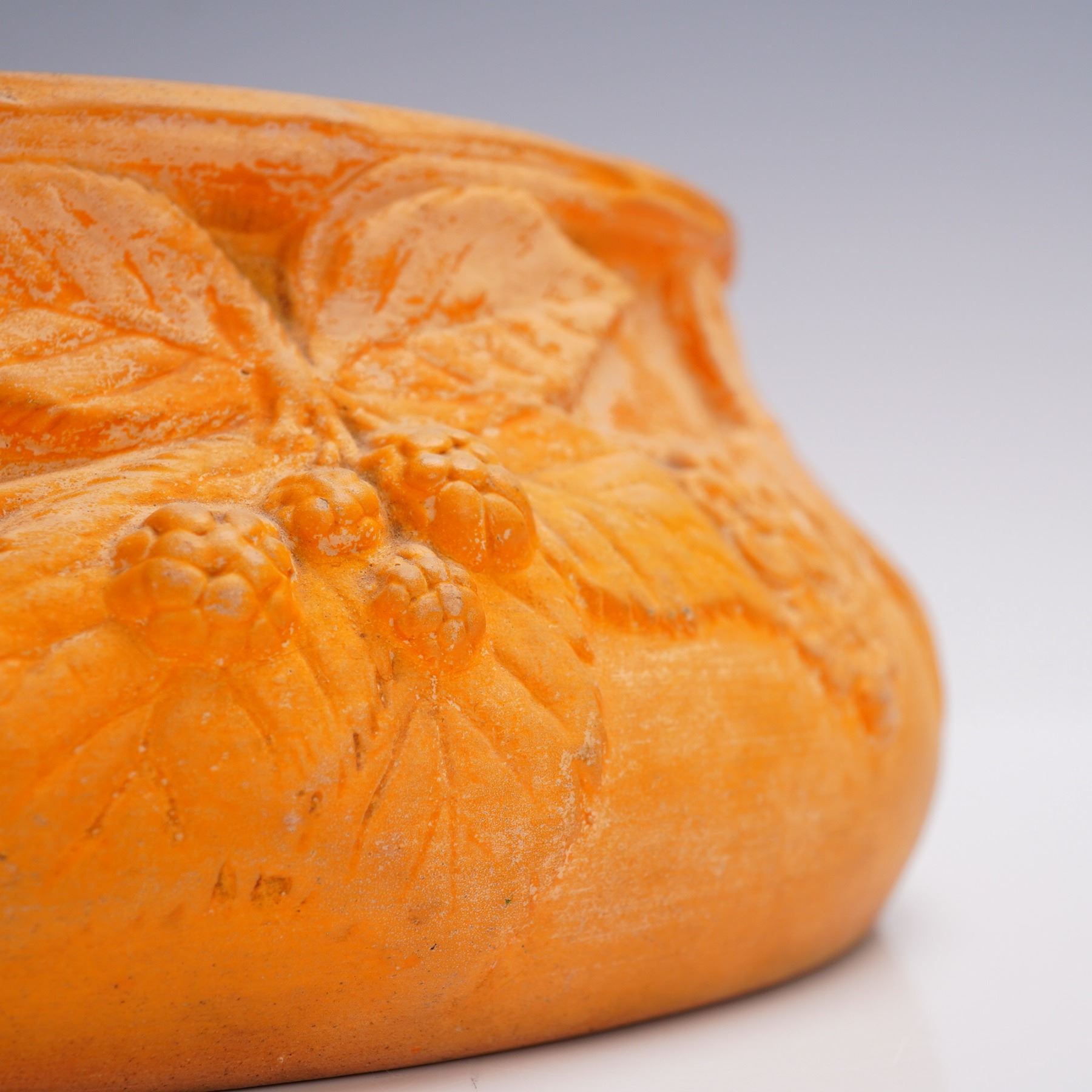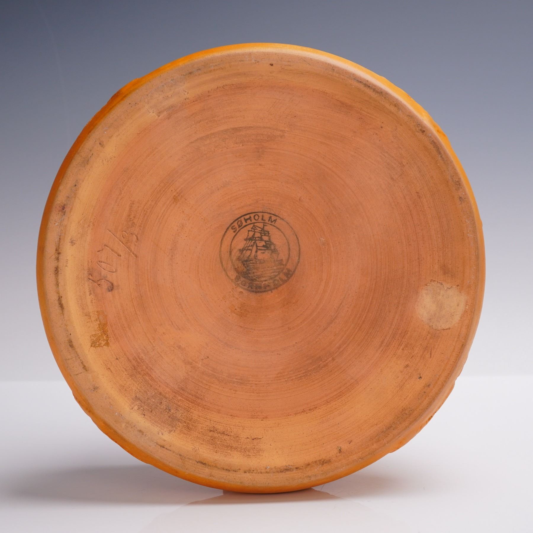A richly textured terracotta-hued ceramic bowl by Soholm, a historic Danish pottery based on the island of Bornholm and active from 1835 to 1996. This piece features a detailed raised floral and berry motif around the exterior and a matte surface that highlights the sculptural relief. The base bears the classic Soholm sailing ship mark and incised form number 507/3. A fine example of Danish stoneware blending decorative craftsmanship with naturalistic form.