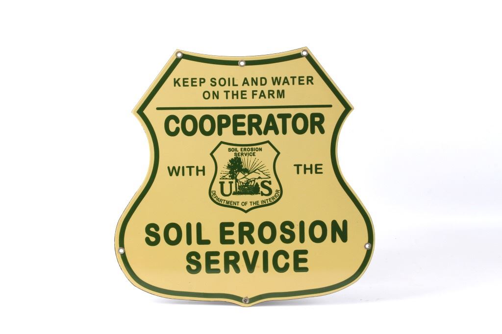 For your consideration is a rare, Soil Erosion Service of the US Department of Interior porcelain sign, circa 1930's. The Soil Erosion Service was created in 1933 to address soil conservation concerns. It was housed in the US Department of Interior and transferred to Department of Agriculture in 1935. The SES trained soil scientists worked directly with farmers and provided equipment, labor, and technical assistance. This sign shows the crest symbol in the center and is yellow with green text reading "Keep Soil and Water on the Farm" at the top and in large green letters "Cooperator with the Soil Erosion Service" around the crest. The sign itself is crest shaped, and it is outlined by a green line and has five grommet holes. This piece is very well preserved show very little sign of fading or peeling for it's age. It measures approximately 14" x 15"