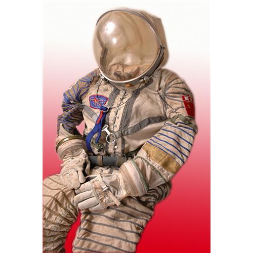 <Our item number 139812><B>Sokol-K "Falcon" Crew Rescue Spacesuit.</B> Developed as a result of the decompression accident onboard Soyuz-11, this first version of a rescue suit was worn by all Soviet crews from Soyuz-12 (1973) till Soyuz-36 (1980). Starting with Soyuz T-2, a modified version of this suit, with two entry zippers on the front, was put into use. Modifications of this version of the suit are still in use to this day.<BR><BR>The Sokol-K rescue space suit was designed to be worn during critical phases of the mission - launch, docking and landing. NPP Zvezda was given the task of providing the suits. They rejected the use of existing Russian space suits and chose to base a new suit on the existing Sokol aviation pressure suit. The main modification to the aviation version of the suit was the replacement of the Sokol suit's hard helmet. Other features of the aviation suit that were considered unnecessary were removed to save weight. The new suit was named the Sokol-K; " ;K" being the abbreviation of the Russian word for space.<BR><BR>The Sokol suit is constructed of two layers: an internal and an external. The internal part is made of an elastic or rubberized-type material and keeps serves to the suit pressurized for the realatively short times the suit was in use. The external layer is made of a flame resistant fabric, a type of Dacron. The suit, including the helmet and feet, is fully integrated; only the gloves are put on seperately. The helmet has a soft back cover and folds back when the wearer is upright: it can only fit over cosmonaut's head when he is lying in a knees-up position. The front of the helmet is clear polycarbonate.<BR><BR>The wearer climbs into the suit via the neck-to-crotch front seam. The suit is then sealed by lacing the seam. The suit does not have its own life support system, but is rather connected to that of the Soyuz. It is thus not a "spacesuit" but a rescue, survival or pressure suit. Only about 300 Soko l flight suits and 135 training/testing suits of all types have been made in the past 35 years and only a limited number have survived the ravages of time.<BR><BR>Although well used, this suit is a prime example of the early state of the art. It is complete with oxygen and air hoses and connectors, gloves (blue astronaut initials on each glove) and rubberized internal pressure lining. There is a red CCCP patch on the left shoulder, a round USSR patch on the right shoulder and a Zvezda blue/red patch on the chest.<BR>It is in need of a good home and will make an important addition to any space collection. <BR>Estimated Value $10,000 - 15,000. <BR><BR>Our item number 139812<BR><IMAGES><P ALIGN="CENTER"><IMG SRC="http://www.goldbergcoins.net/liveauction/49jpegs/139812.jpg"> </P></IMAGES>