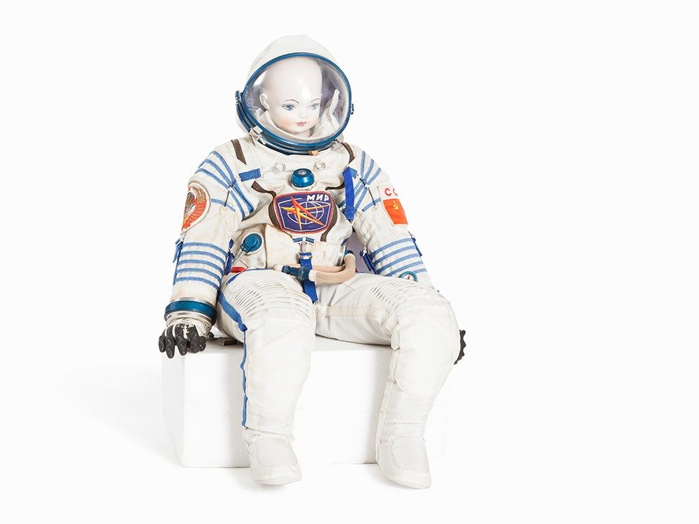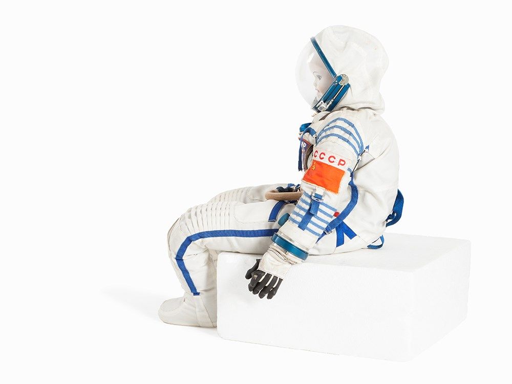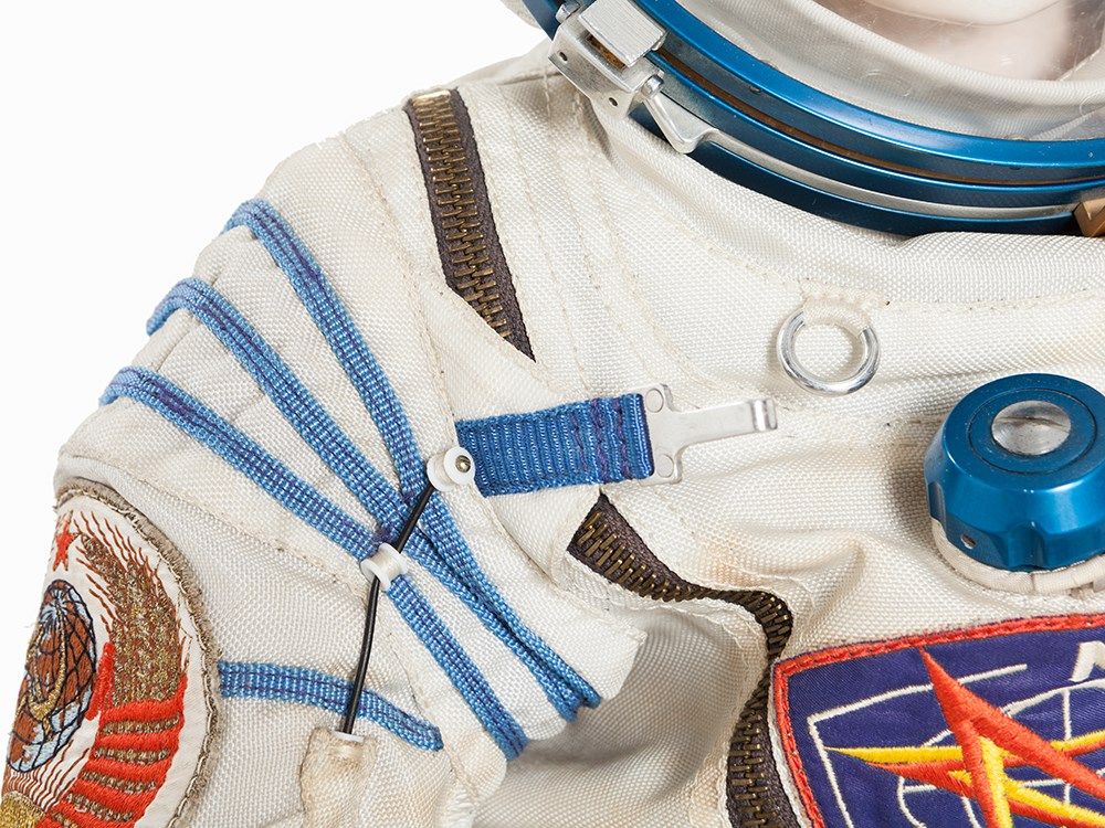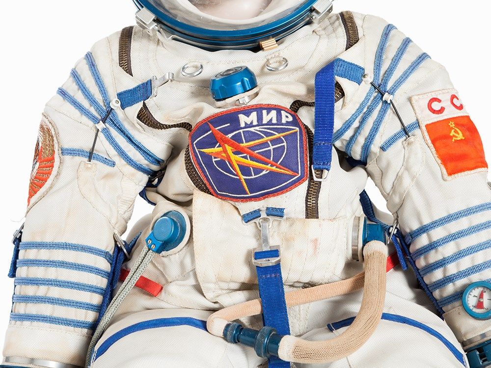 Space suits were tailor-made by NPP Zwezda for every cosmonaut. After leaving the cosmonaut corps, the cosmonauts had the opportunity to purchase their space suit. However, due to the fact that the space suits were re-used again, it was not always possible. For this reason, smaller versions of their space suits were made for some of them. These possessed, such as the present example of a Sokol KV-2 suit, of almost all the original functions of the real suits. The Sokol space suit was worn by all cosmonauts on board of the Soyuz spaceship at launch, landing and docking maneuvers. It came into use for the first time in 1973 on a flight to the Russian space station MIR and is in use until today by the Russian aeronautics.