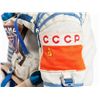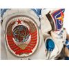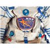 The model space suit bears the patches of the MNP (= Mir), CCCP and a Soviet crest. The space suit is in good condition with some staining on the fabric, scratches on the plastic protective visor of the helmet and tears in the gloves. The CCCP patch is slightly coming off. The dimensions are 86 x 40 cm (height x width).
