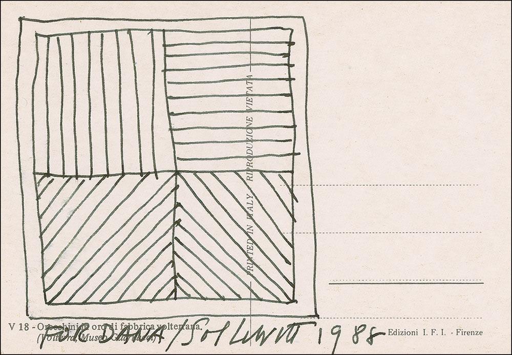 Original signed and inscribed felt tip sketch of geometric cubes on the reverse of an off-white 6 x 4 postally unused picture postcard, signed and inscribed “For Dana/Sol Lewitt 1988.” In very fine condition.