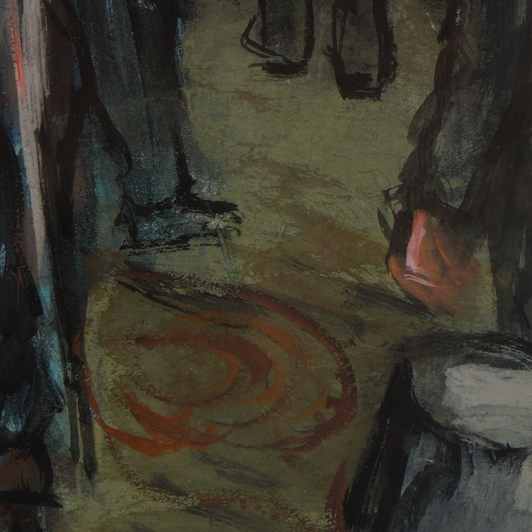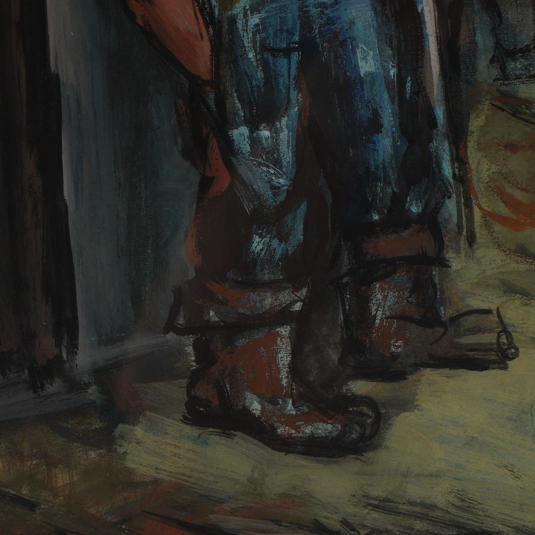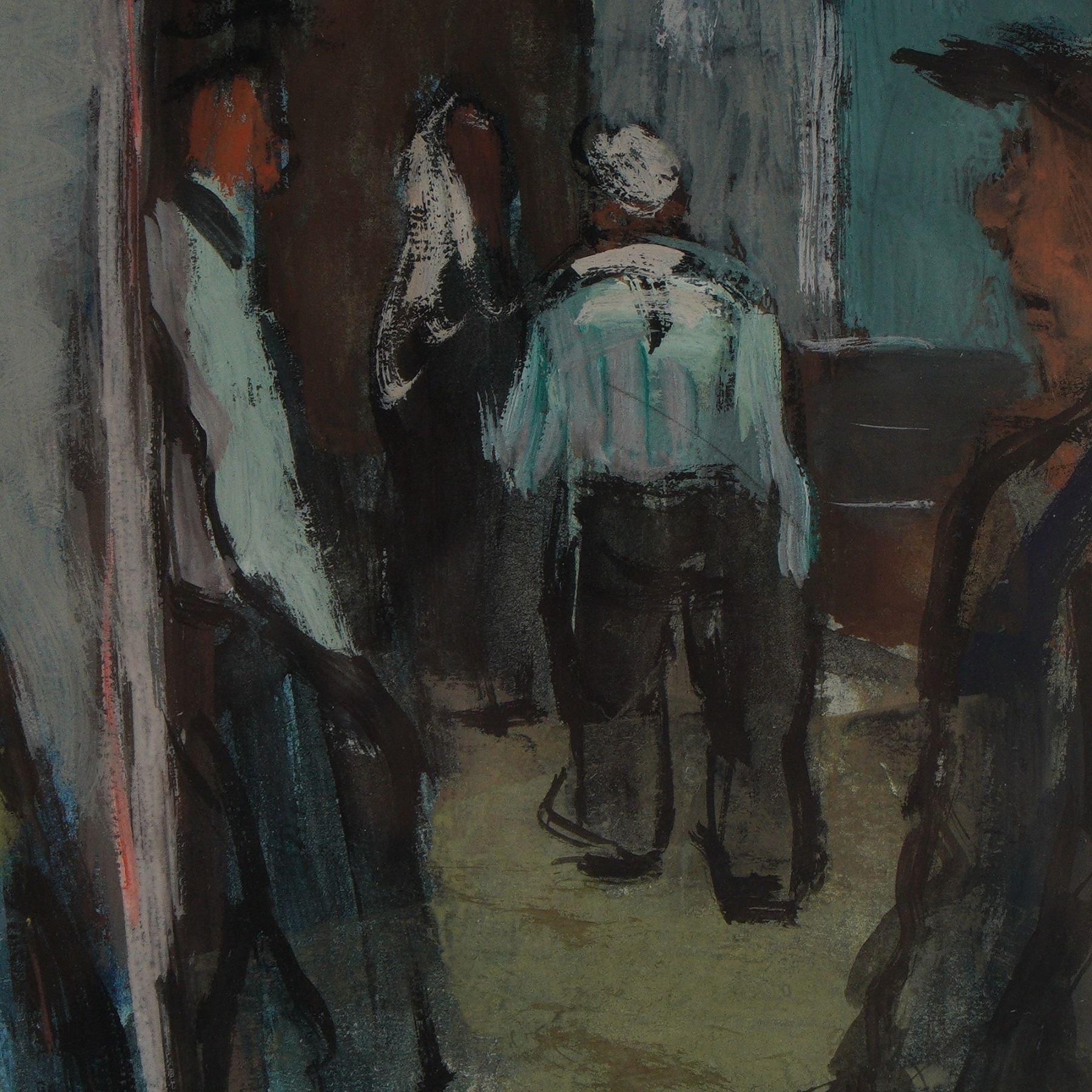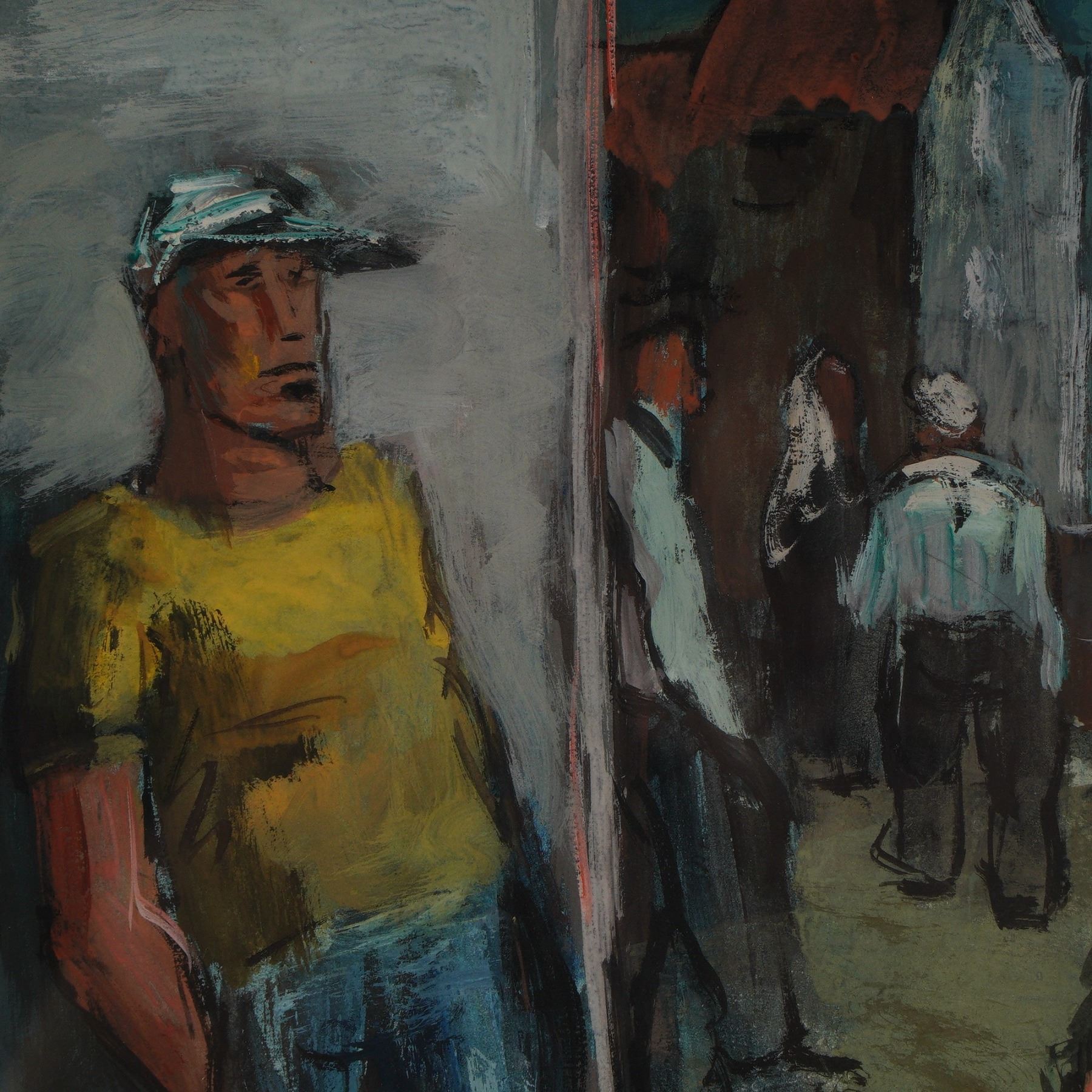 Outstanding watercolor and gouache on paper board by American artist Solomon (Sol) Wilson, titled Young Man in Baseball Cap. The composition captures a striking street scene in Wilson's signature expressive style, with bold brushstrokes and rich earthy tones. The central figure, dressed in a yellow shirt and blue jeans, leans casually against a wall, his contemplative stance contrasted by the movement of figures in the background. Solomon Wilson was a New York-based painter known for his urban realist scenes and depictions of working-class life, often infusing his subjects with psychological depth and an acute sense of place. His works have been exhibited in numerous galleries and remain prized for their vibrant, emotive portrayals of American life in the mid-20th century. Signed lower right.