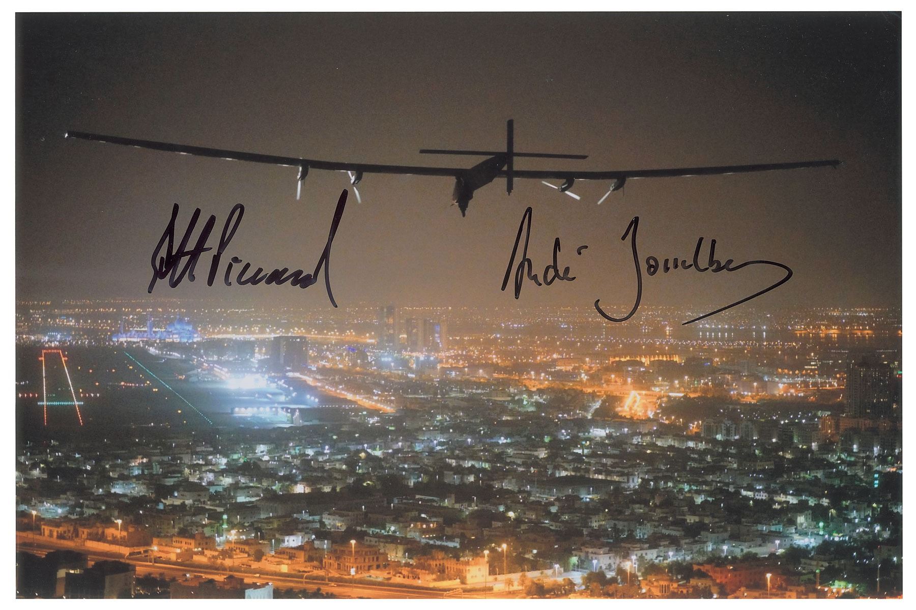 Two color glossy photos of the Solar Impulse experimental solar-powered aircraft and its crew, 12 x 8 and 7.25 x 5, each signed in black felt tip by Bertrand Piccard and Andre Borschberg. In fine condition, with a ding to one corner tip of the larger photo.