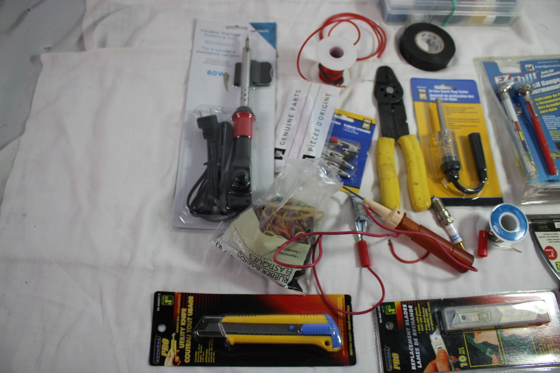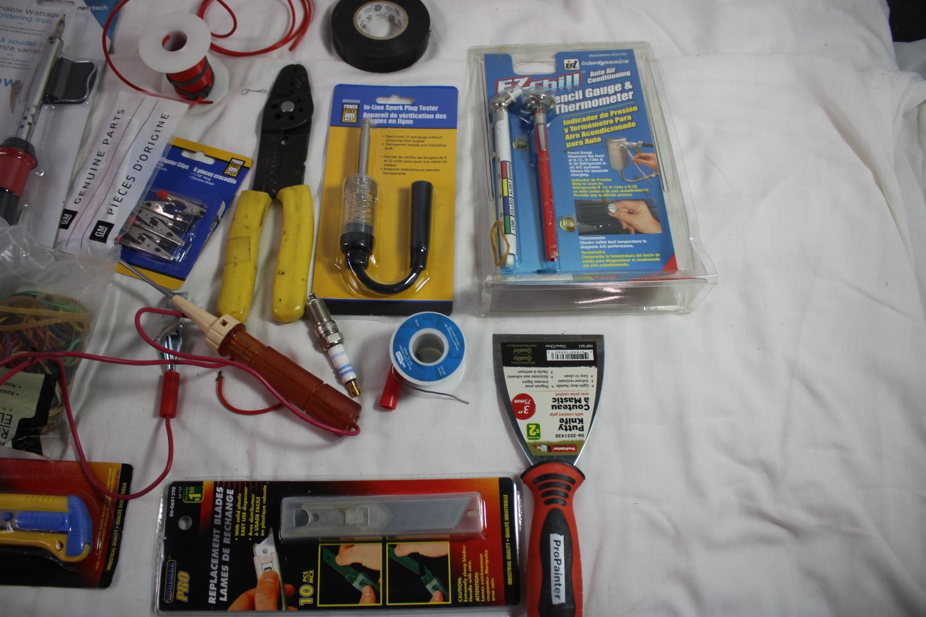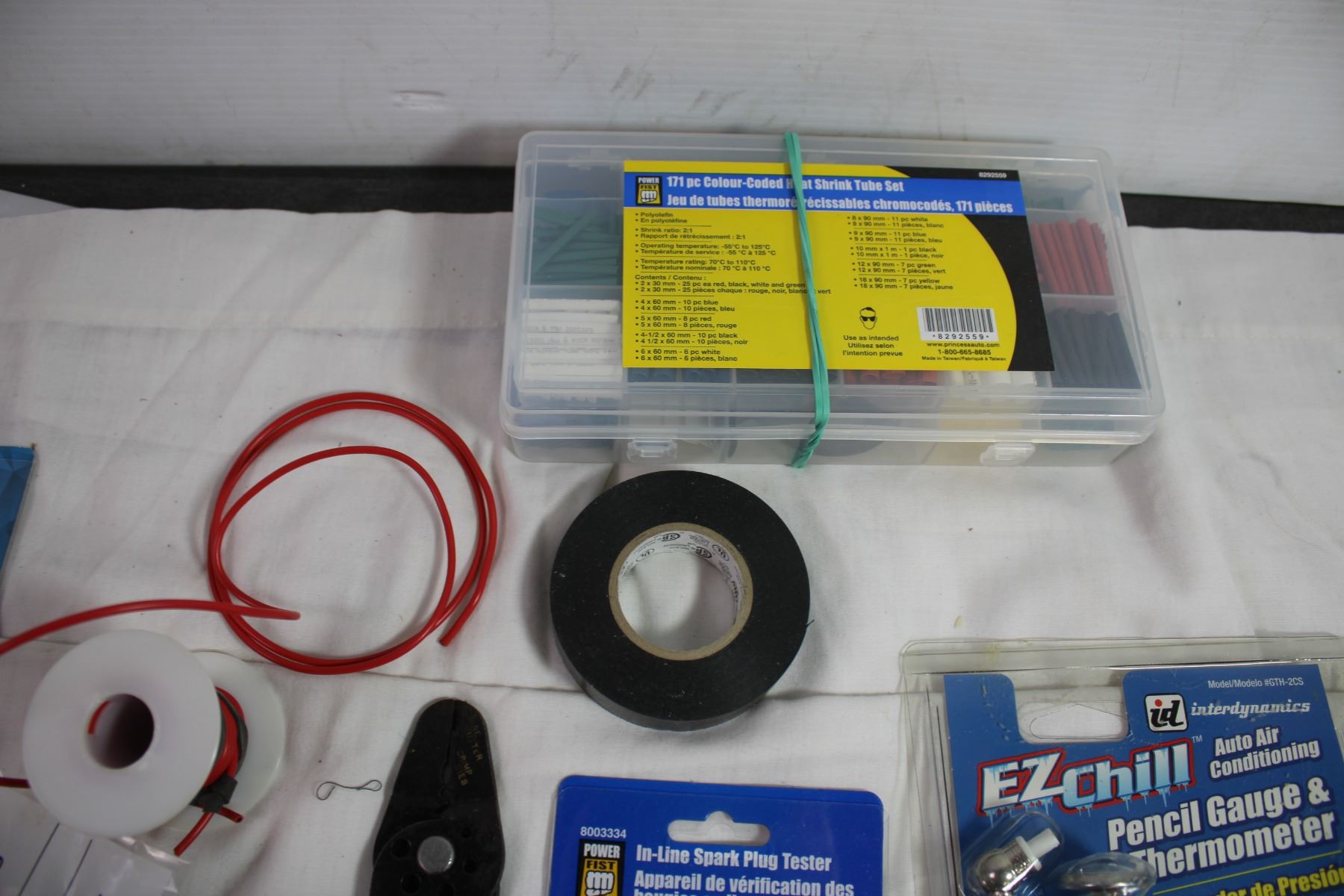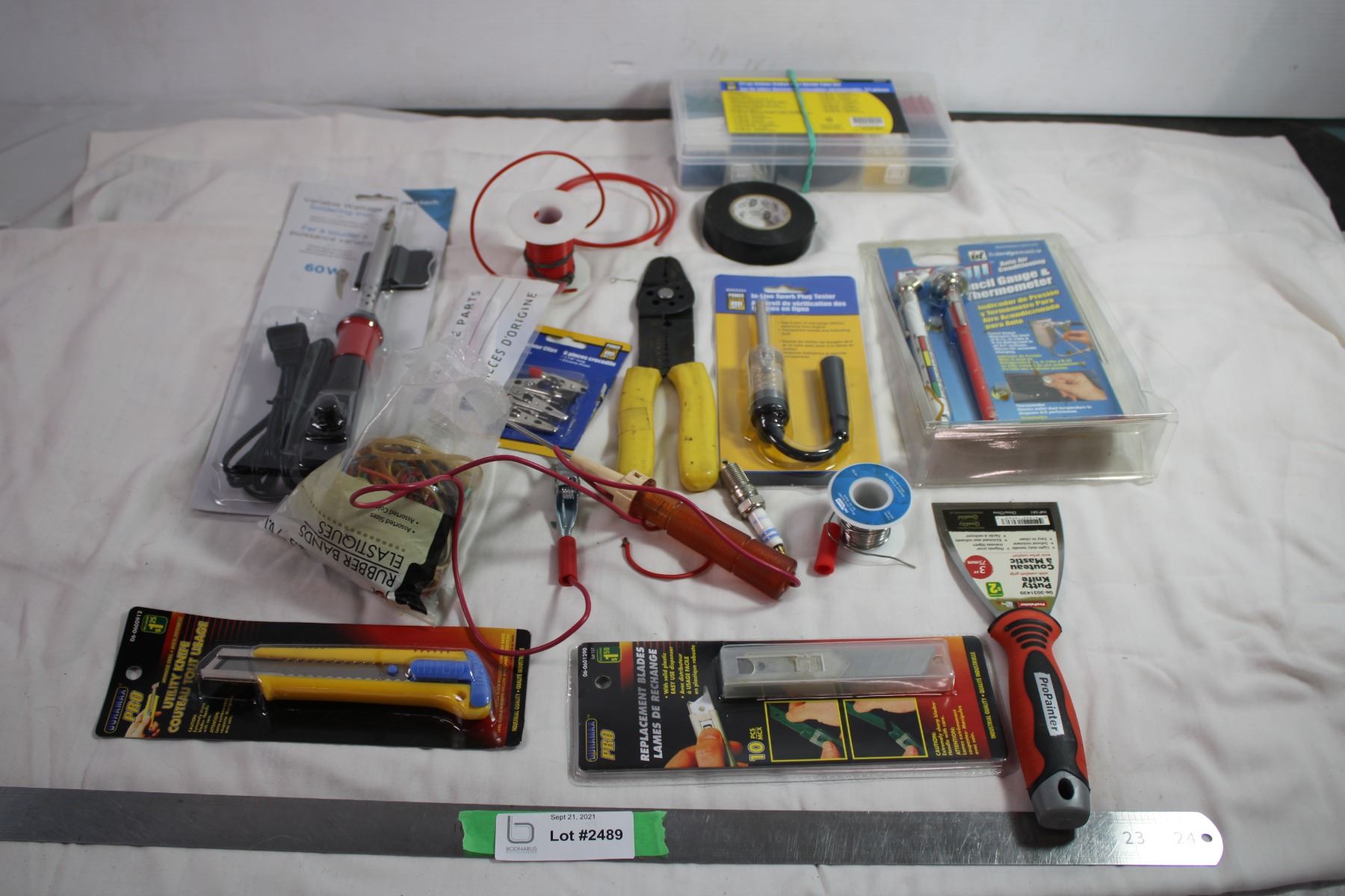 Soldering Irons + heat shrink tubing + utility knife + Tire pressure gauge + wire + solder + other misc items