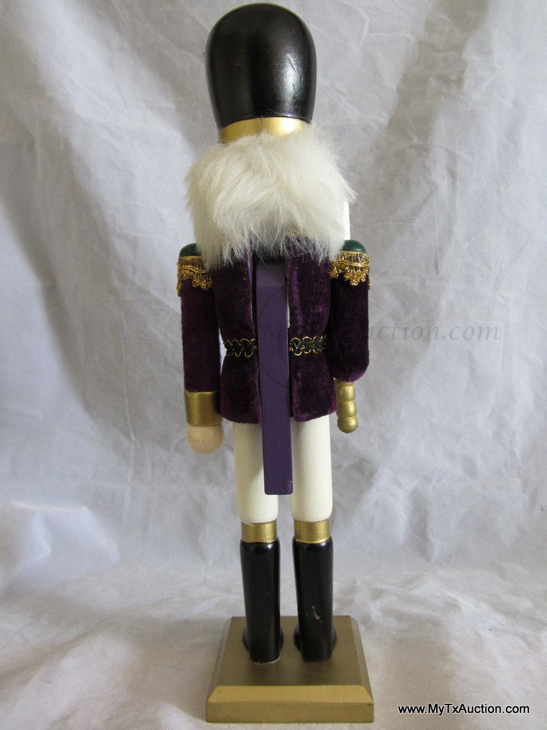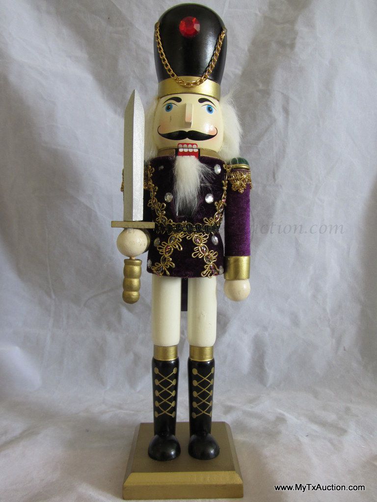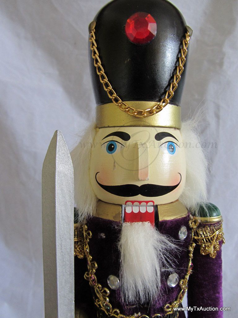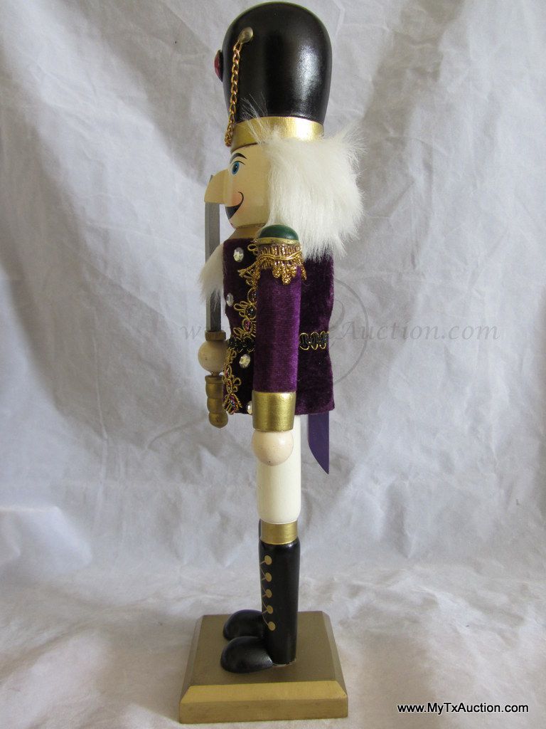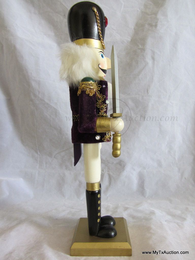 Unknown maker 15" Royal Guards Nutcracker is all decked out in purple velvet jacket, sword raised ready to protect. He is in like new condition with the exception of the small battle wound on his cheek. NOTE: not in original box (See images for details)