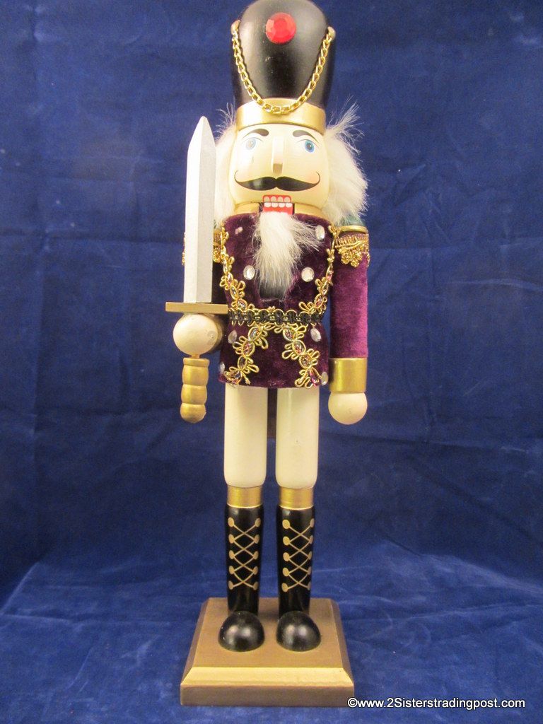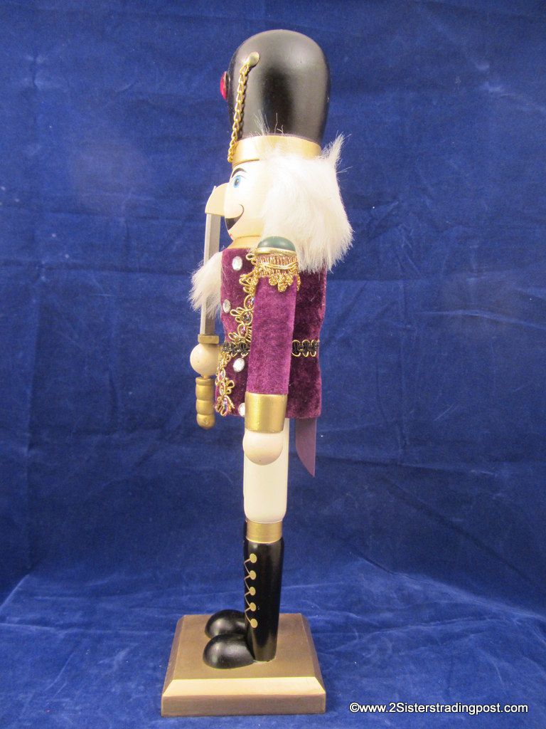 Unknown maker 15" Royal Guards Nutcracker is all decked out in purple velvet jacket, sword raised ready to protect. He is very good used condition. NOTE: Has a small smug on right cheek and paint bubble on left leg, not in original box (See images for details)