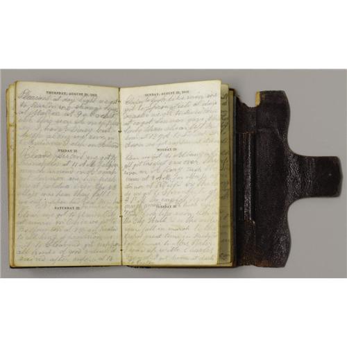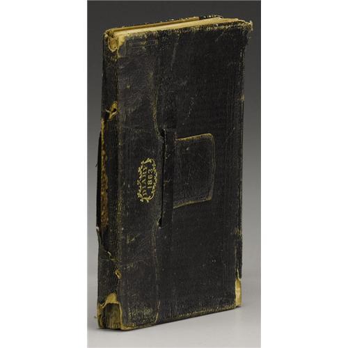 <B>A Soldier's Diary from the 23rd Connecticut - New Orleans Occupation.</B></I> This Civil War soldier's diary was owned by Private Levi French of the 23rd Connecticut Infantry. It is from the year 1863 and is filled with his observations of his travels during the year written in pencil and in ink. He even lists all the captains of his regiment in the back of the book with a brief chronological overview of the year. While sometimes colorful in language, he is very descriptive in his writings of the countryside, the Southerners, and the black citizens he encounters.<BR><BR>The 23rd Connecticut was organized at New Haven, Connecticut on November 14, 1862, just before this diary starts. Private French writes that he is from Fairfield, Connecticut and that he is at “Camp Parapet, seven miles above New Orleans”. From there, the unit made their way around Louisiana seeing action at Berwick, Louisiana.<BR><BR>Measuring approximately 3” x 5”, this leather diary has the words 'Diary 1863' embossed in gold on its strap. There are tears at the binding but otherwise is in good condition.<BR><BR><b>Shipping:</b> Miscellaneous Collectibles, Smal (<a target="_blank" href="http://www.heritageauctions.com/common/shipping.php">view shipping information</a>)