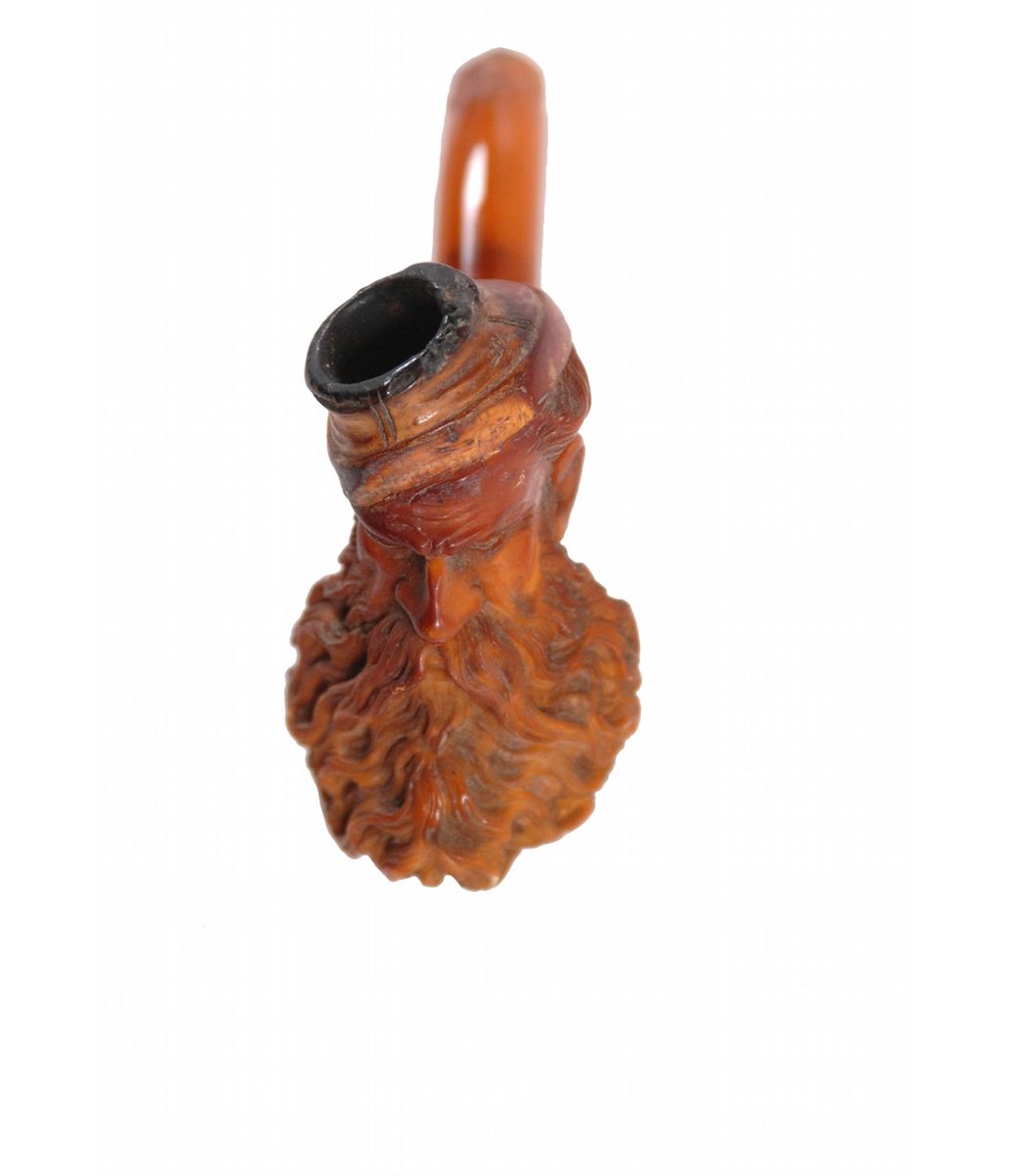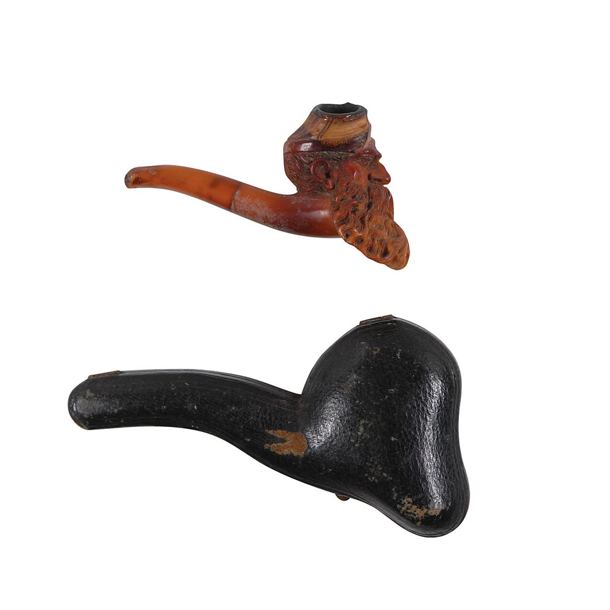 Very detailed, and well-used, hand-carved meerschaum Civil War soldier’s pipe. Two-piece pipe measures approximately 4? long with a detailed relief of a heavily bearded soldier with a kepi perched atop his head. Pipe comes with its original leather case and has turned a mild amber from use. The brim of the kepi has broken off and is not included.