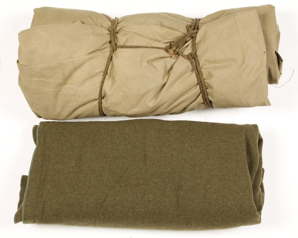 With stake, pole, and olive green blanket. Tent has some staining and tears, blanket in overall good condition.