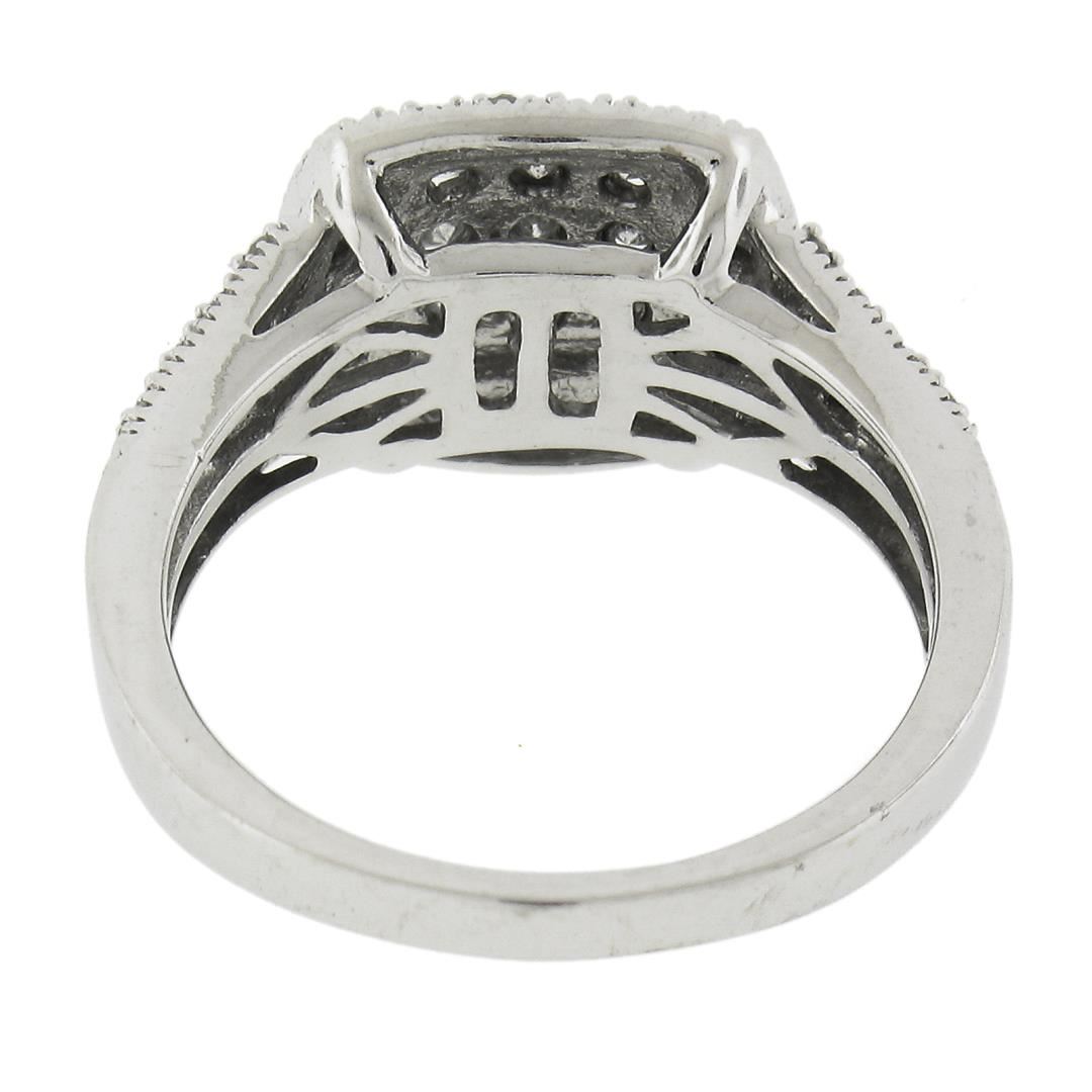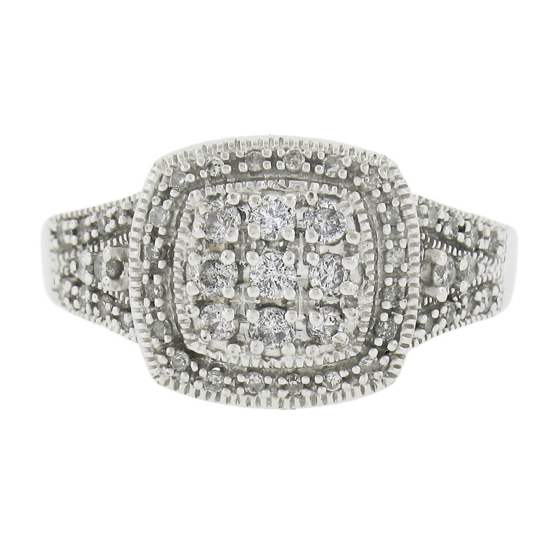A solid 10k white gold ring, with numerous of round cut natural diamonds (G-I - I1-I3 ; 0.50ctw). The ring is size 6.5, weighs a total of 4.43 grams, and measures 11.5mm wide.