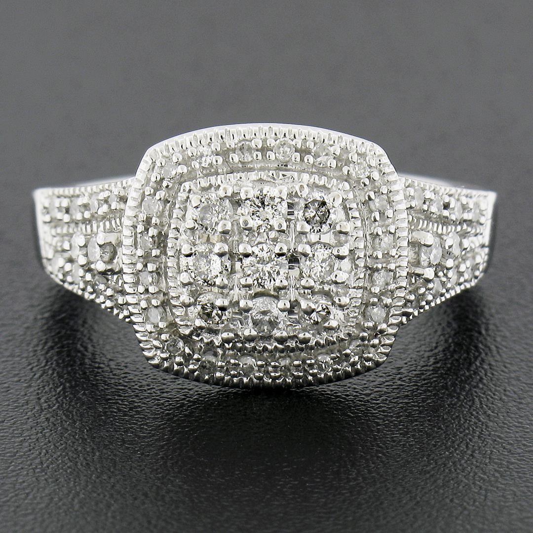 A solid 10k white gold ring, with numerous of round cut natural diamonds (G-I - I1-I3 ; 0.50ctw). The ring is size 6.5, weighs a total of 4.43 grams, and measures 11.5mm wide.