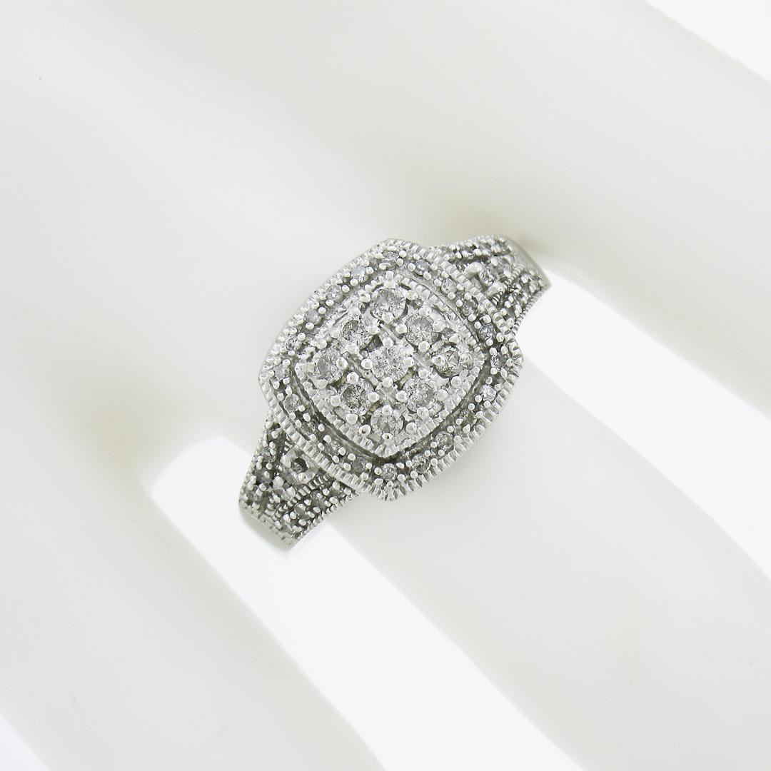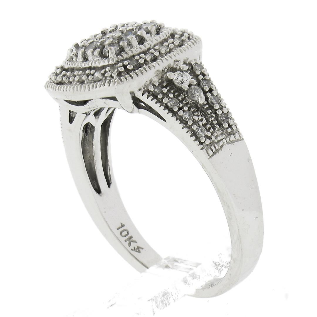 A solid 10k white gold ring, with numerous of round cut natural diamonds (G-I - I1-I3 ; 0.50ctw). The ring is size 6.5, weighs a total of 4.43 grams, and measures 11.5mm wide.