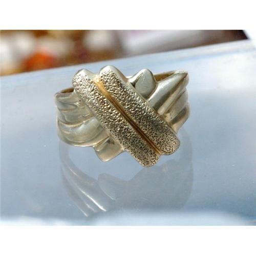 Nice hefty looking solid 14k Yellow Gold ladies ring with a cris cross design. There are two channel of nuggets textured gold that goes over a tripled channel smooth gold. Well you get the idea from the pictures. <p> The size is 6 1/3. The face of the ring is 17mm wide. The weight is approximately 2 grams or less. ( my scale will not weigh anything less that 2 grams.) <p> It is a fabulous ring that I used to wear a lot years ago. It is very comfortable and attractive. <p>