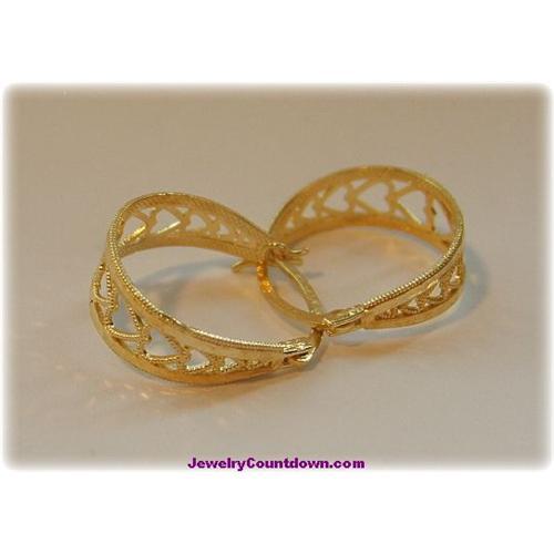 Solid 14 Karat Yellow Gold Hoop Earrings feature a Filigree Heart Design!<BR><BR>Materials: Solid 14 Karat Yellow Gold<BR><BR>Weight: 3 grams<BR><BR>Approximate Diameter: 5/8 Inch (20mm)<BR><BR>Approximate Width: 3/8 Inch (10mm)<BR><BR>Style: Pierced Hoop Earrings<BR><BR>Our merchandise is guaranteed 100% to your satisfaction. If you DON'T LOVE this item, simply return it for a complete refund of your purchase price. BONDED SELLER.<BR><BR>