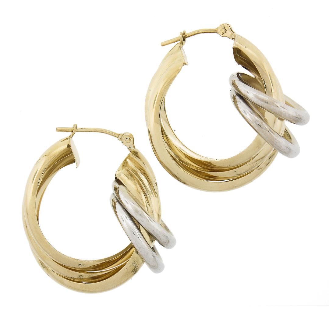 A solid 14k yellow & white gold hoop earrings. The earrings measure approximately 25.2x14mm and weigh a total of 5.06 grams.