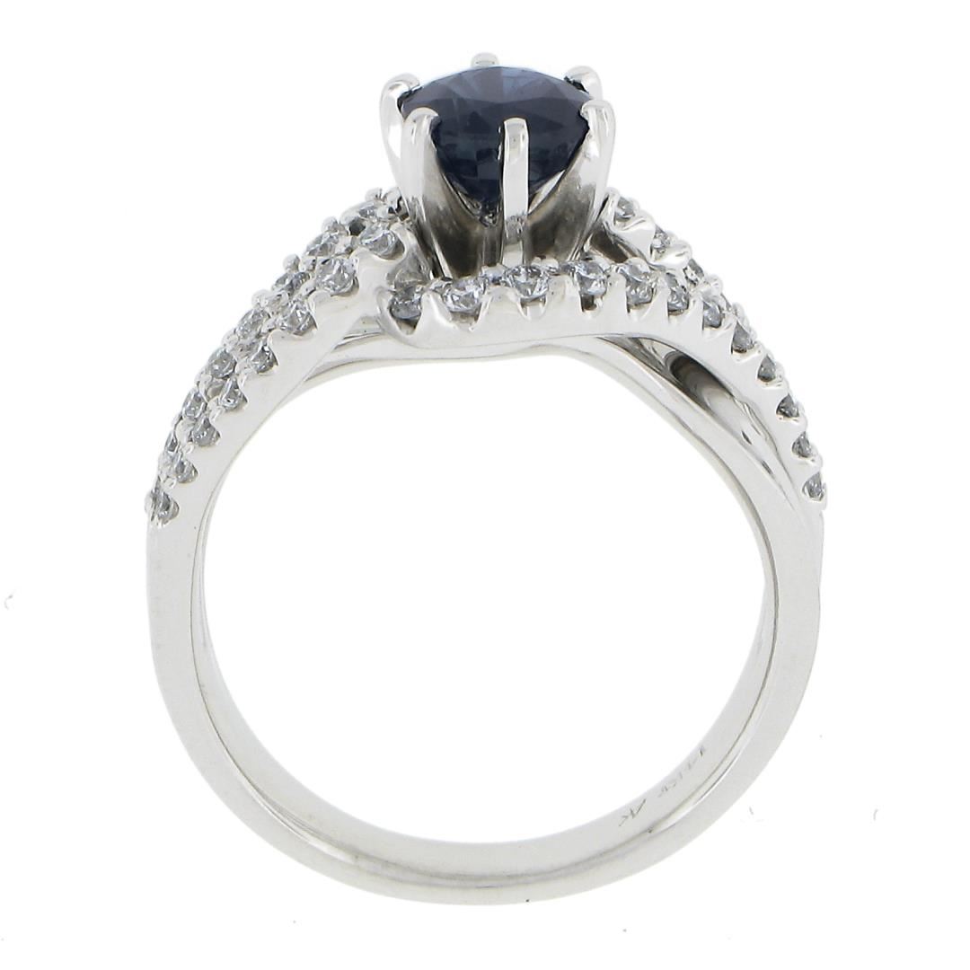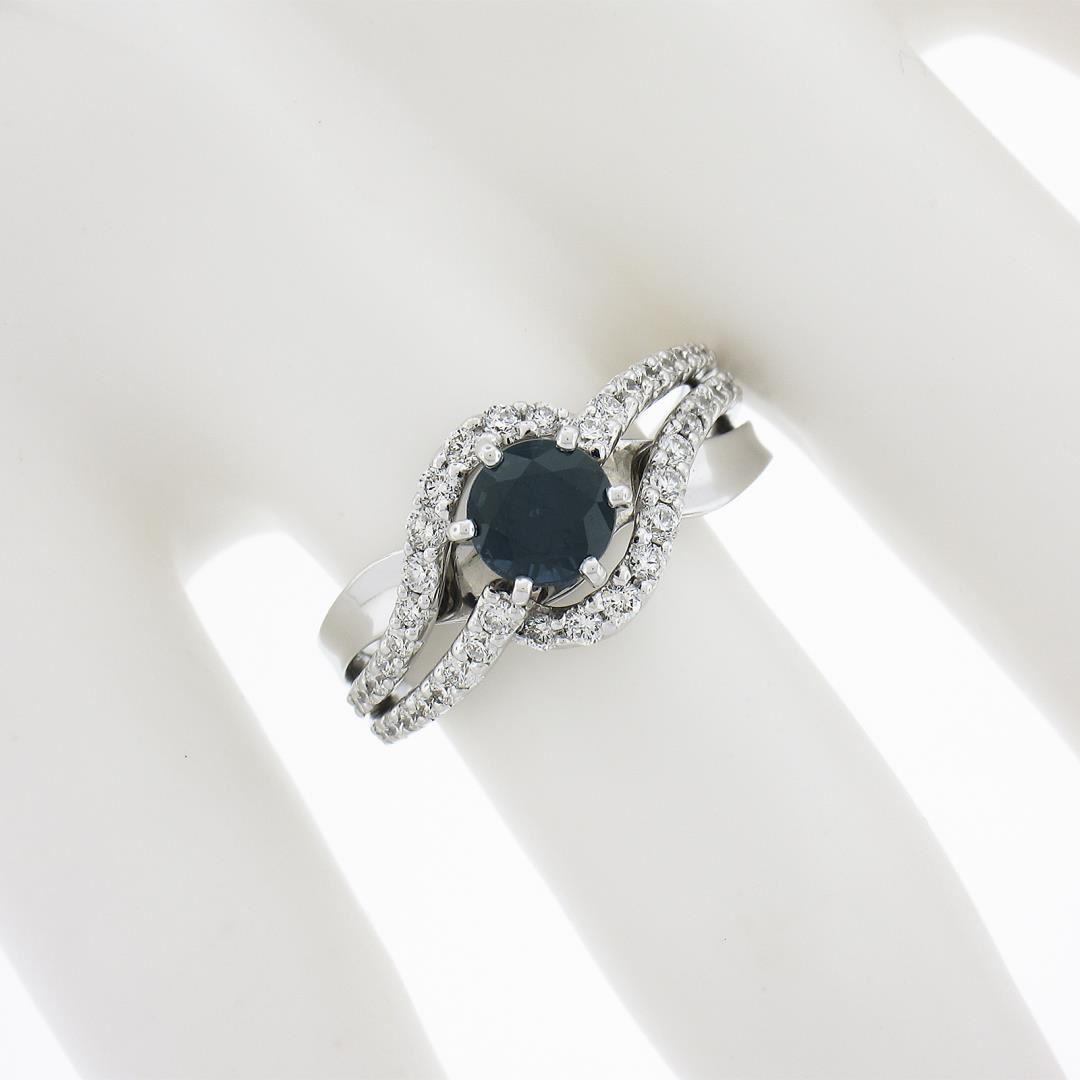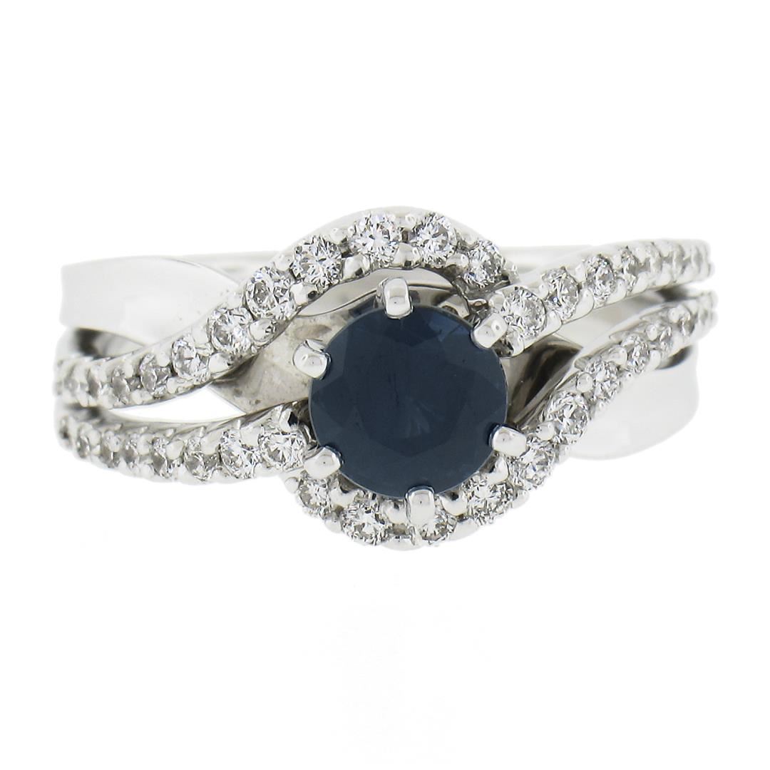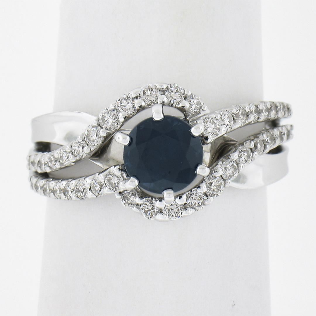 A solid 14k white gold wavy ring, with 1 round cut natural sapphire (0.90+ct), and 40 round cut natural diamonds (F/G - VS1-SI1 ; 0.50ctw). The ring is size 6.0, weighs a total of 5.53 grams, and measures 10.1mm wide.
