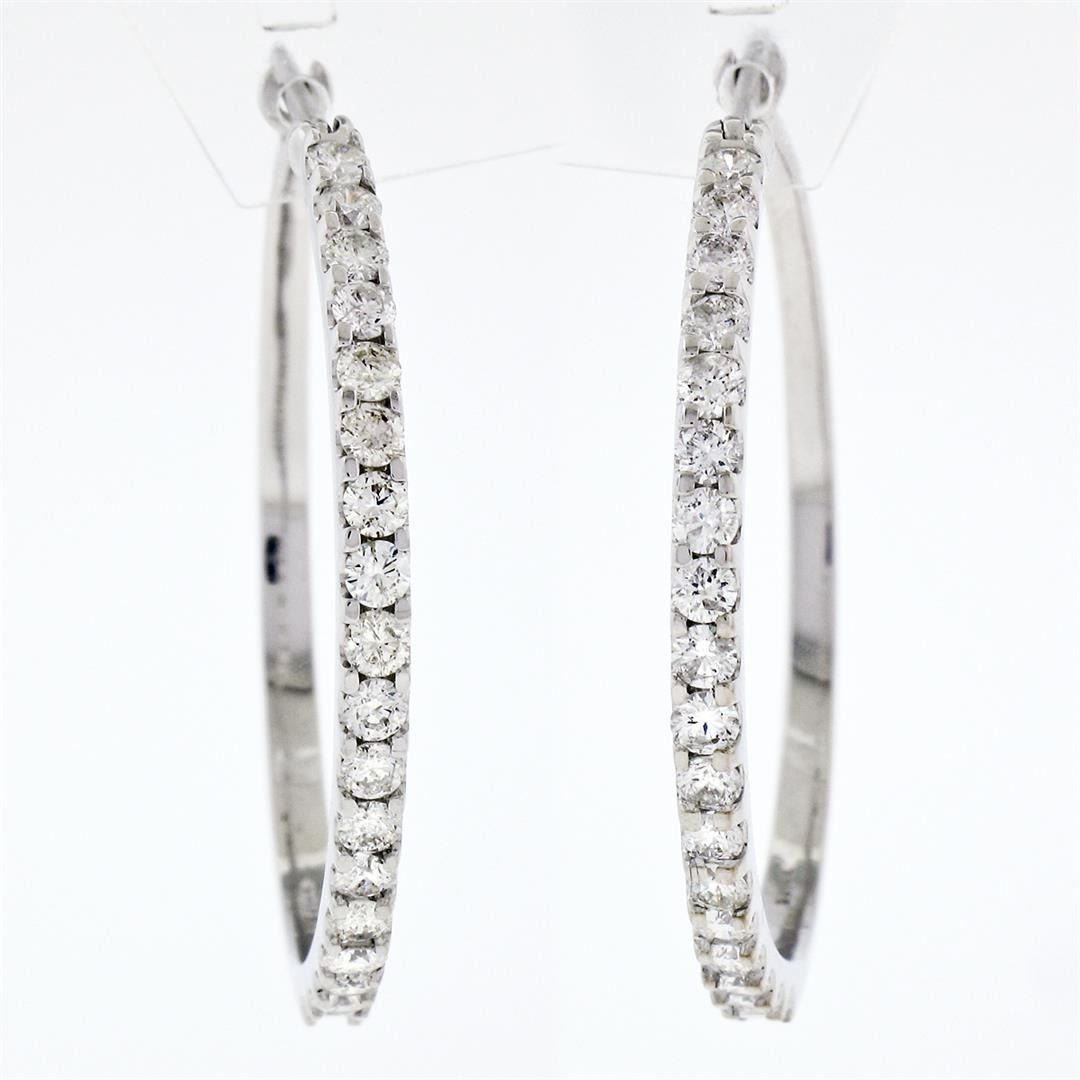 An estate solid 14k white gold hoop earrings, with 36 round brilliant cut natural diamonds (G/H- VS2/SI1; 1.50ctw). The earrings measure approximately 32.0x2.40mm and weigh a total of 6.08 grams.